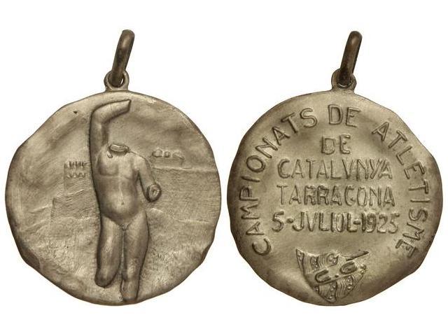 Campionats de Atletisme de Catalunya. - 5 Juliol 1925. - TARRAGONA. CLUB GIMNÀSTIC TARRAGONA. - Anv.: Escultura femenina clásica, detrás muralla. Rev.: Leyenda, debajo escudo del Nastic. Metal plateado. Ø 34 mm. Con anilla. EBC. - -