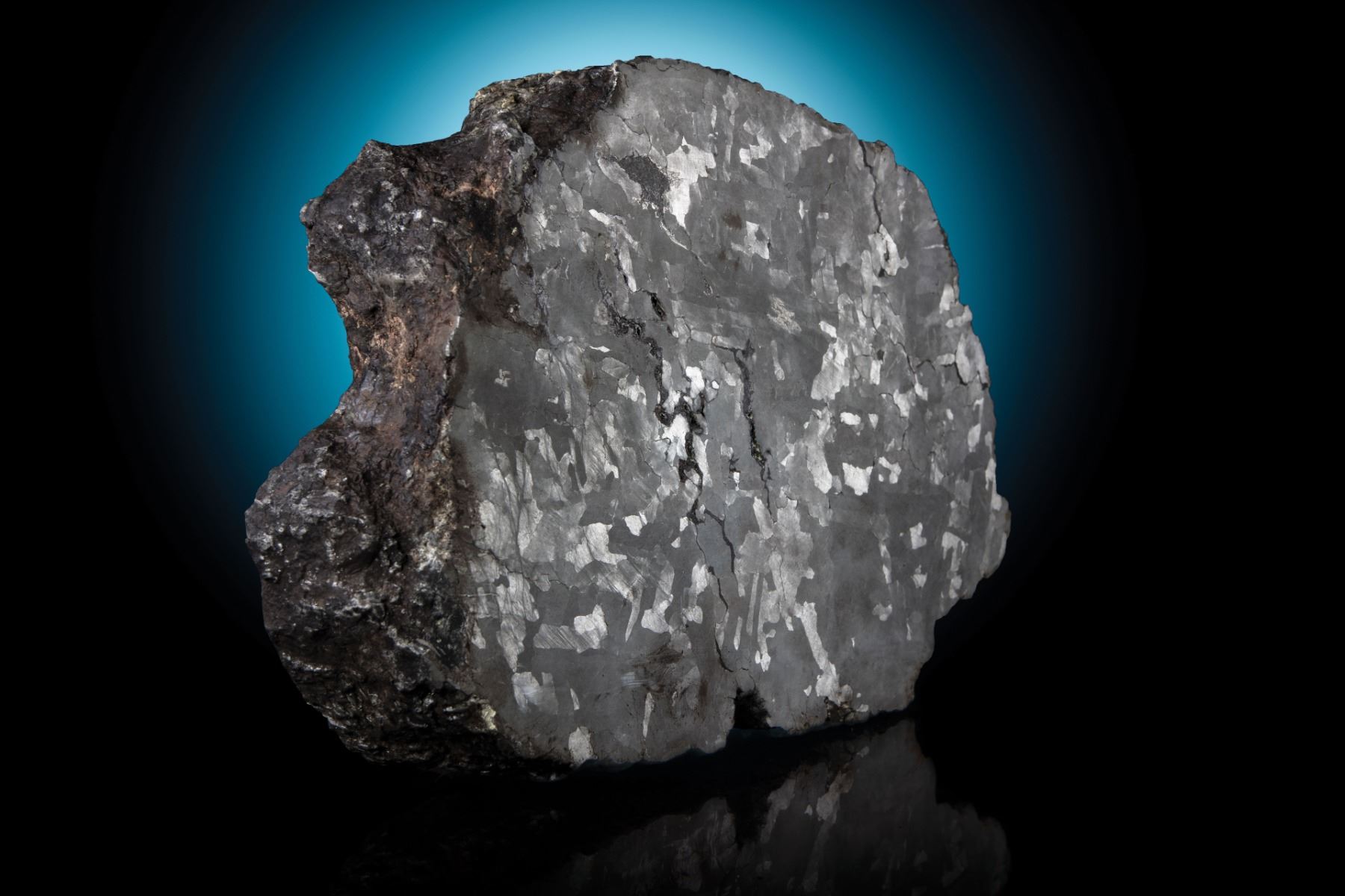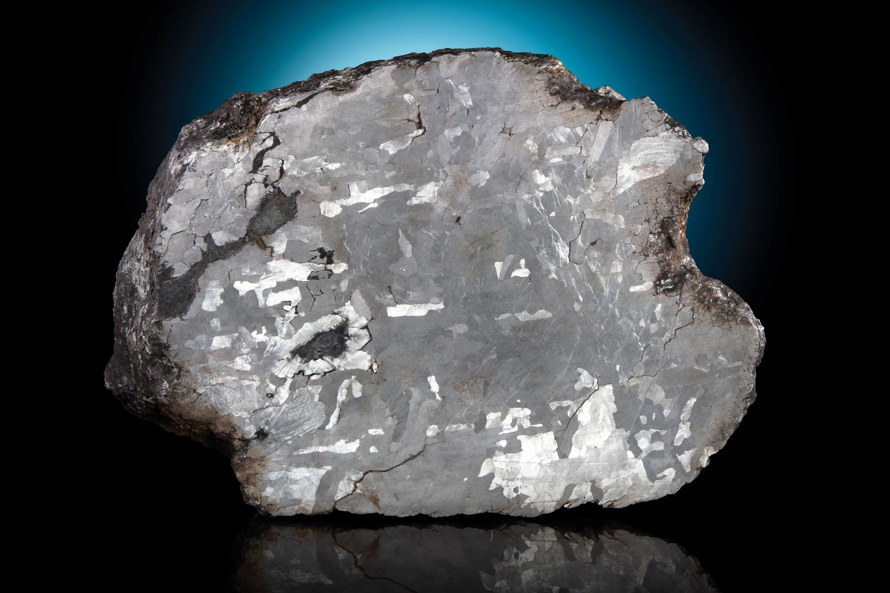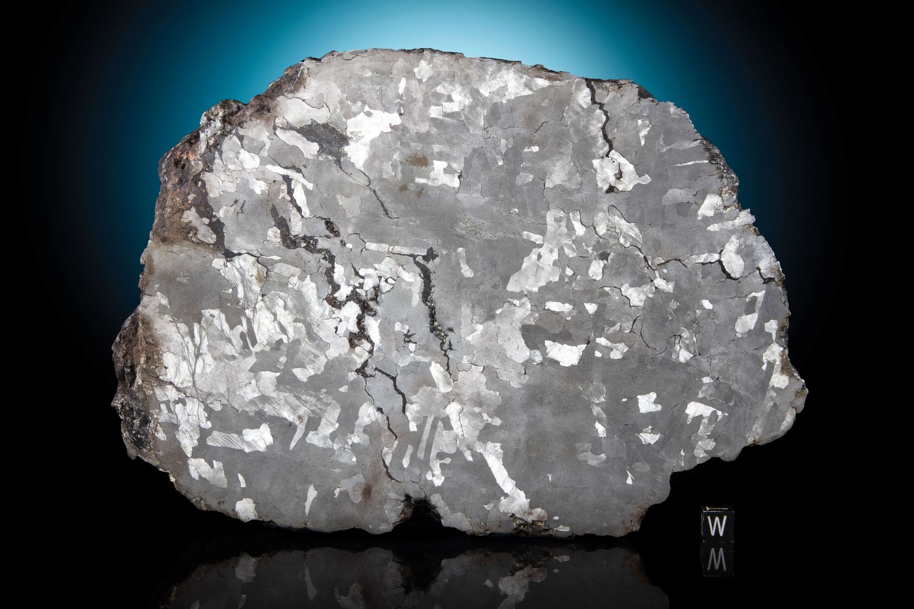 Iron meteorite, IAB. First described 1576, Argentina. Full slice with laboratory-prepared surface and inclusions, 8,331 grams (18 1/3 pounds). The interiors of some iron meteorites tell a story that is markedly different from their exteriors, and this hefty Campo del Cielo lab-prepared section is just such an example. The structure of iron meteorites is determined by the examination of two nickel-iron alloys—taenite and kamacite. As a result of very slow cooling in space, these alloys typically form into a complex interlocking crystalline motif known as the Widmanstätten Pattern, named after Count Alois von Beckh Widmanstätten who recorded the phenomenon while experimenting with iron meteorites during the 19th century.