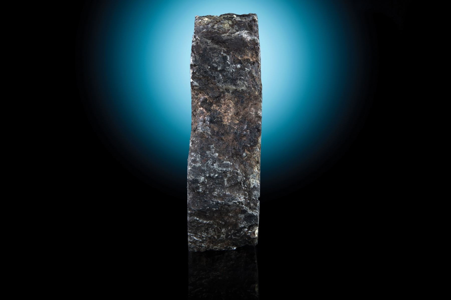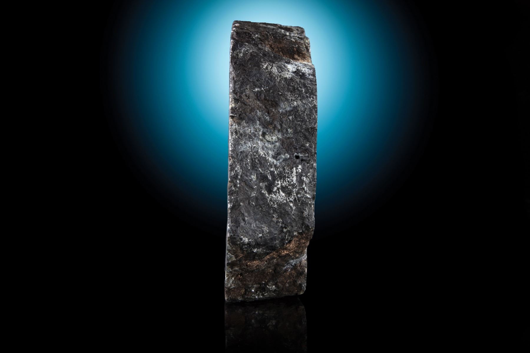 This miraculous lattice-like arrangement can be very beautiful and is generally visible only after iron meteorites have been carefully prepared in the laboratory by cutting and polishing, followed by etching of the cut surfaces with a volatile solution of alcohol and nitric acid, known as nitol. The kamacite crystals revealed by this process are measured and the average bandwidth is used to subdivide iron meteorites into a number of structural classes. An iron with very narrow bands, less than 1mm, is known as a “fine octahedrite,” while one with a very wide band would be described as a “coarse octahedrite.” Campo del Cielo is a coarse octahedrite and its silvery interlocking bands, known as lamellae, can very clearly be seen in this example. Note the black silicate-graphite-troilite inclusions. This hefty slice has been meticulously stabilized by an expert laboratory prep artist and should be around to be enjoyed for at least another 5,000 years. Accompanied by a certificate of authenticity from Aerolite Meteorites.