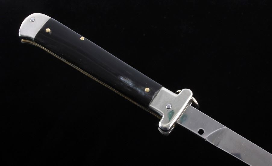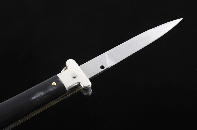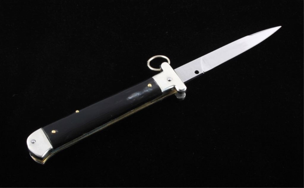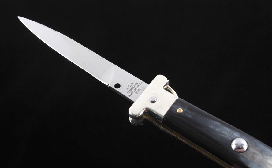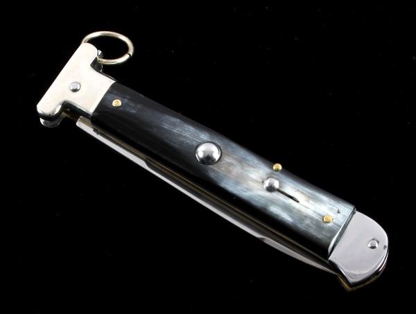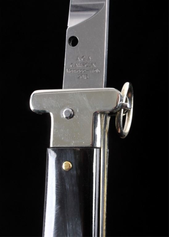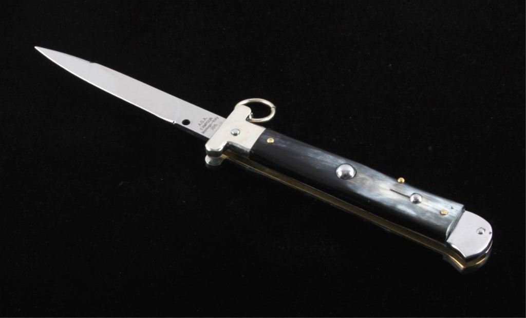 This is an Italian made Campolin ring pull stiletto switchblade knife. The knife has a stainless steel blade marked "A.G.A. Campolin Maniago Italy 2015" and features a genuine buffalo horn handle. The push button release on the handle releases the blade. The ring pull closes the blade. The Italian switchblade knife is in very good condition. It measures 8.5" with a 3.75" blade.