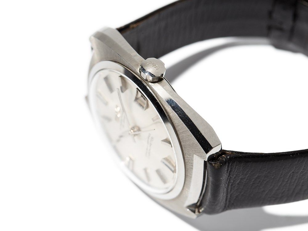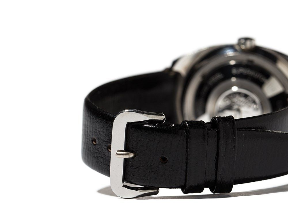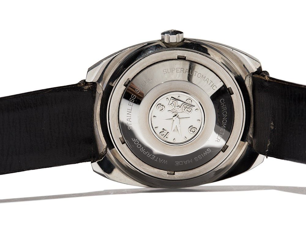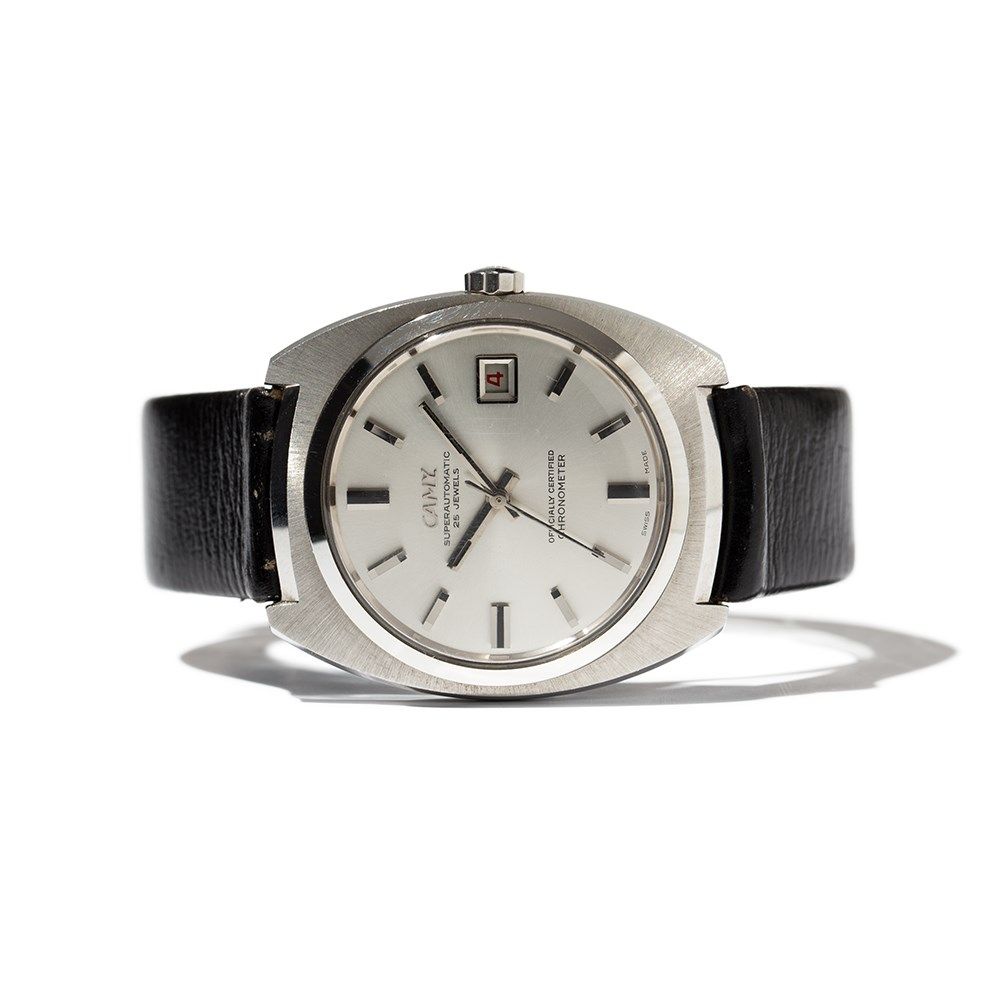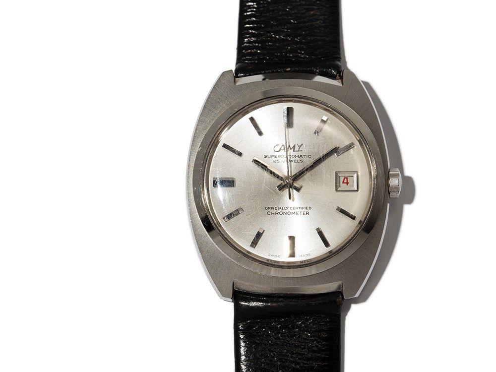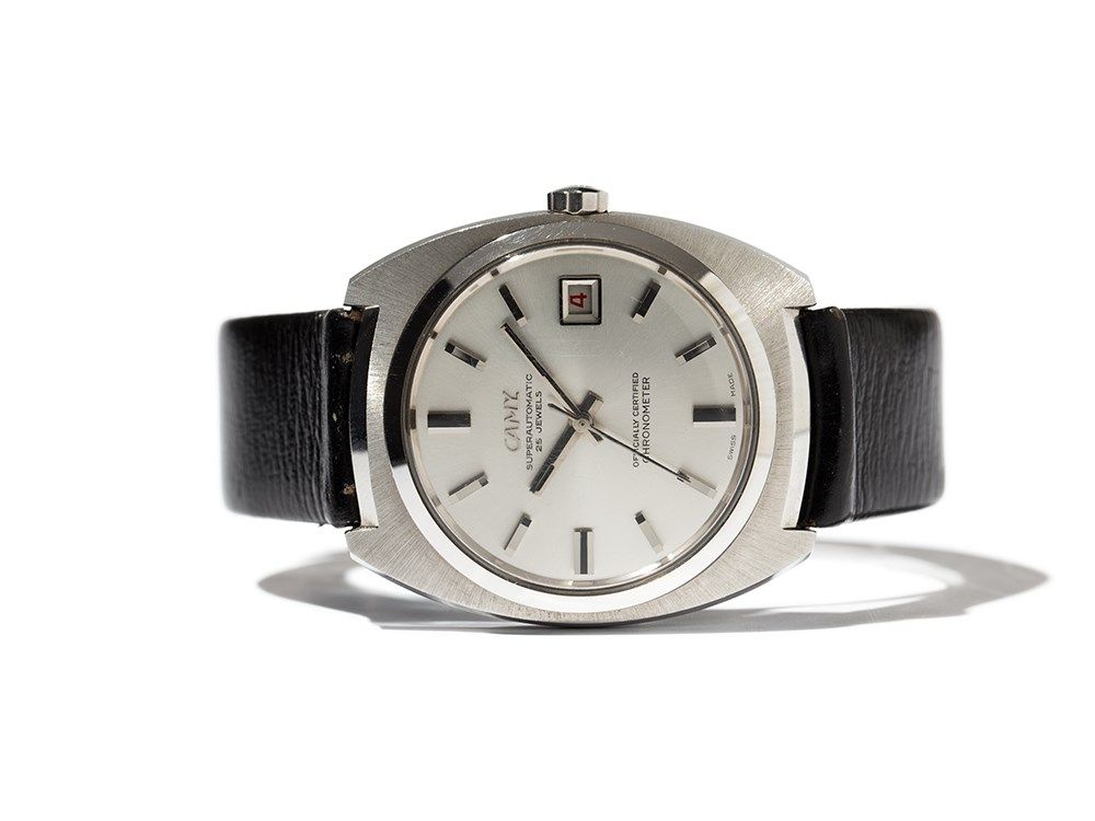 This chronometer wristwatch by Camy was made in Switzerland around 1970. The watch is fitted with an automatic movement calibre ETA 2472 with 25 jewels and displays hour, minute, second and date. The silver dial shows silver hands. Watch case and crown are made of stainless steel. The watch has a black leather strap with pin buckle. The watch case number is 66265. The movement number is 66265. Maker’s mark on dial, crown, watch case and movement.