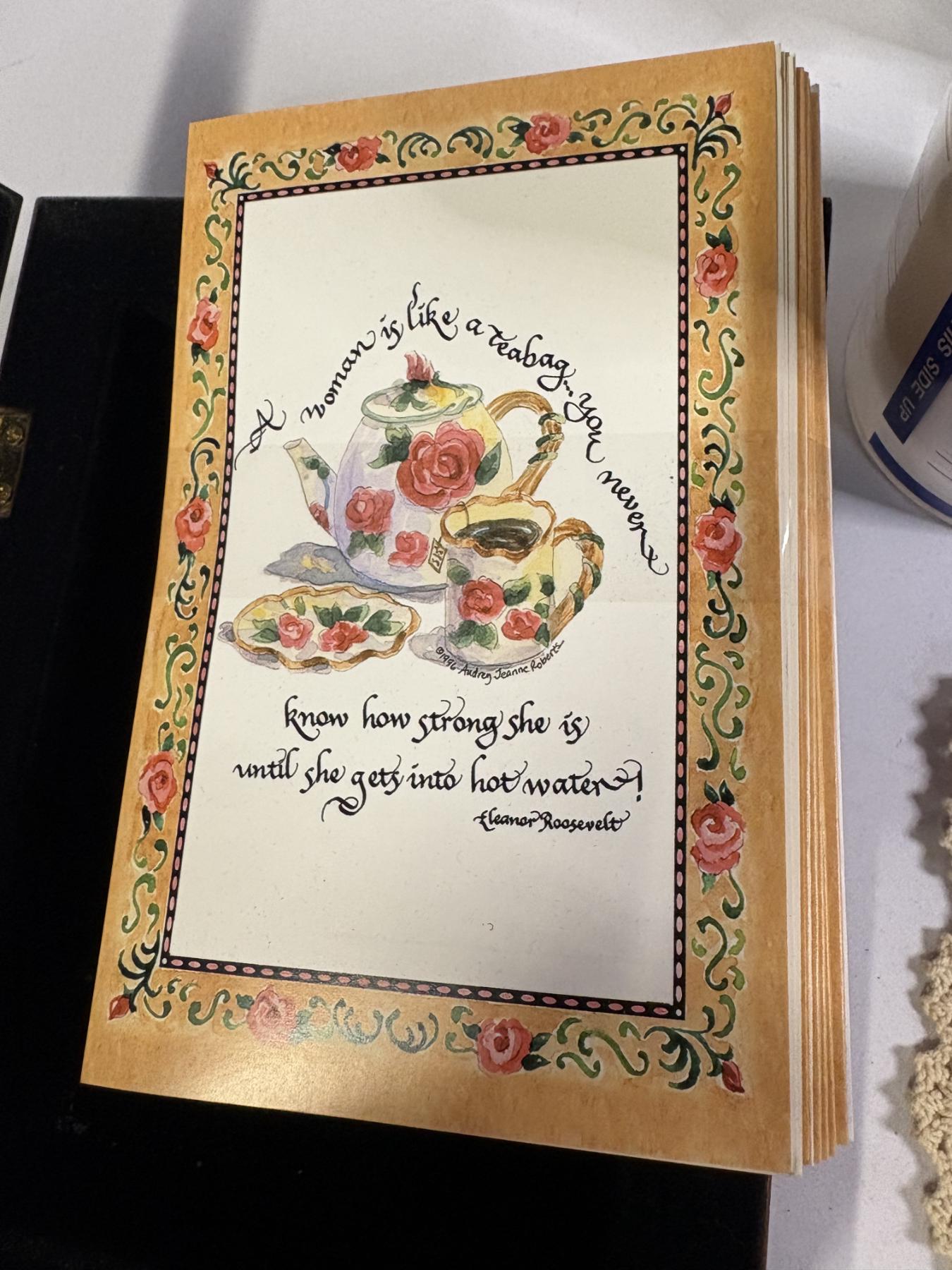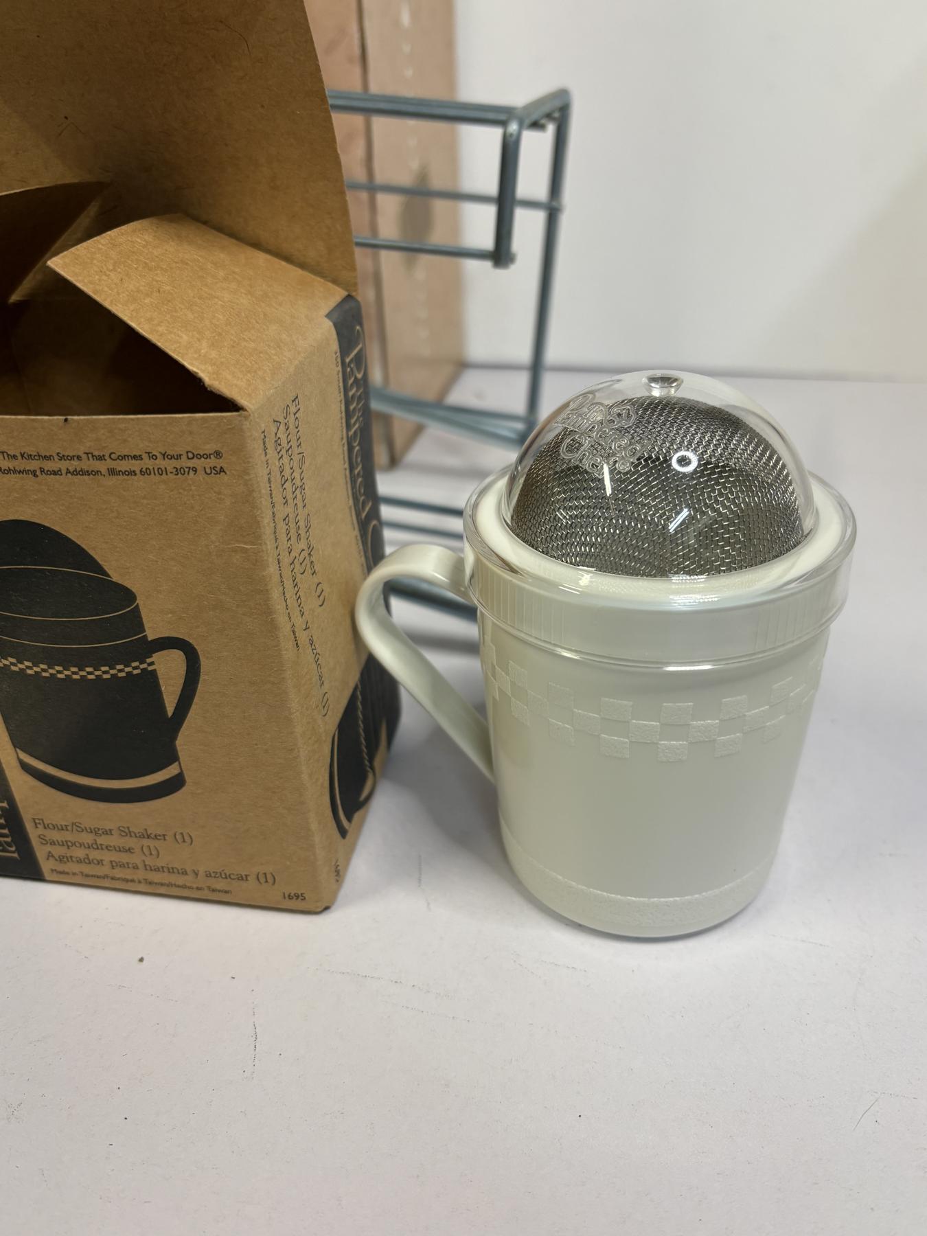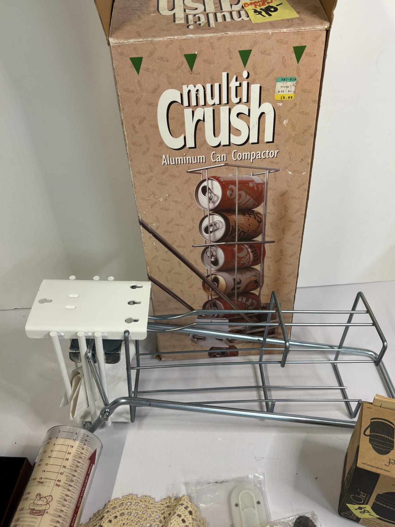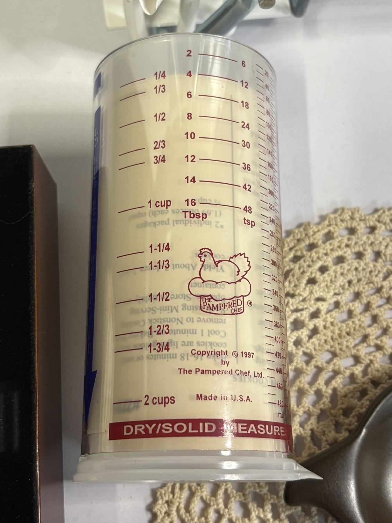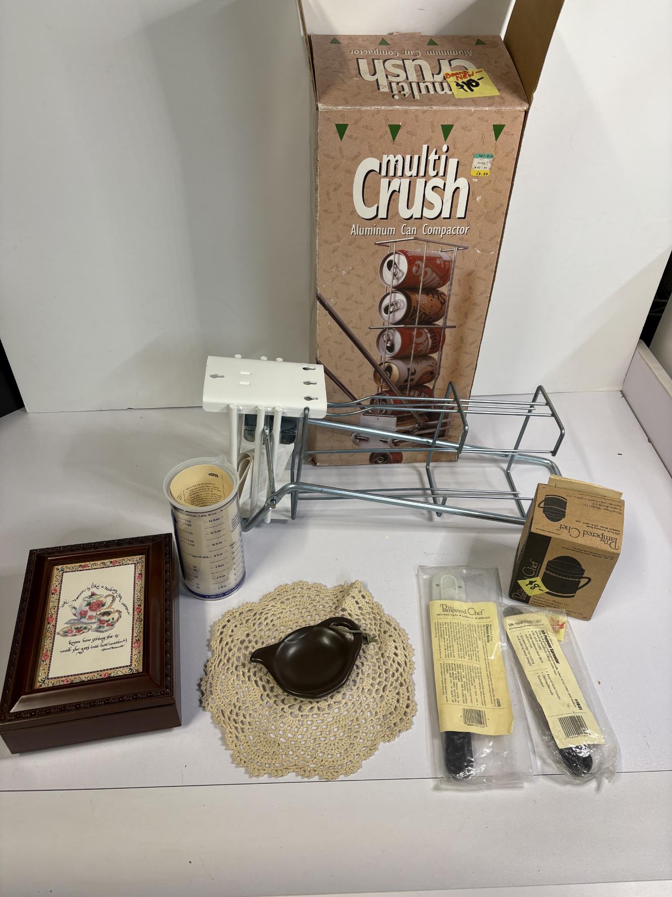 Can Crusher - Teapot Jewelry Box with Cards & Envelopes - Tea Pot Spoon Holder - Doily - Pampered Chef Measuring Cup - Pampered Chef Sugar/Flour Shaker - Pampered Chef Cheese Knife
