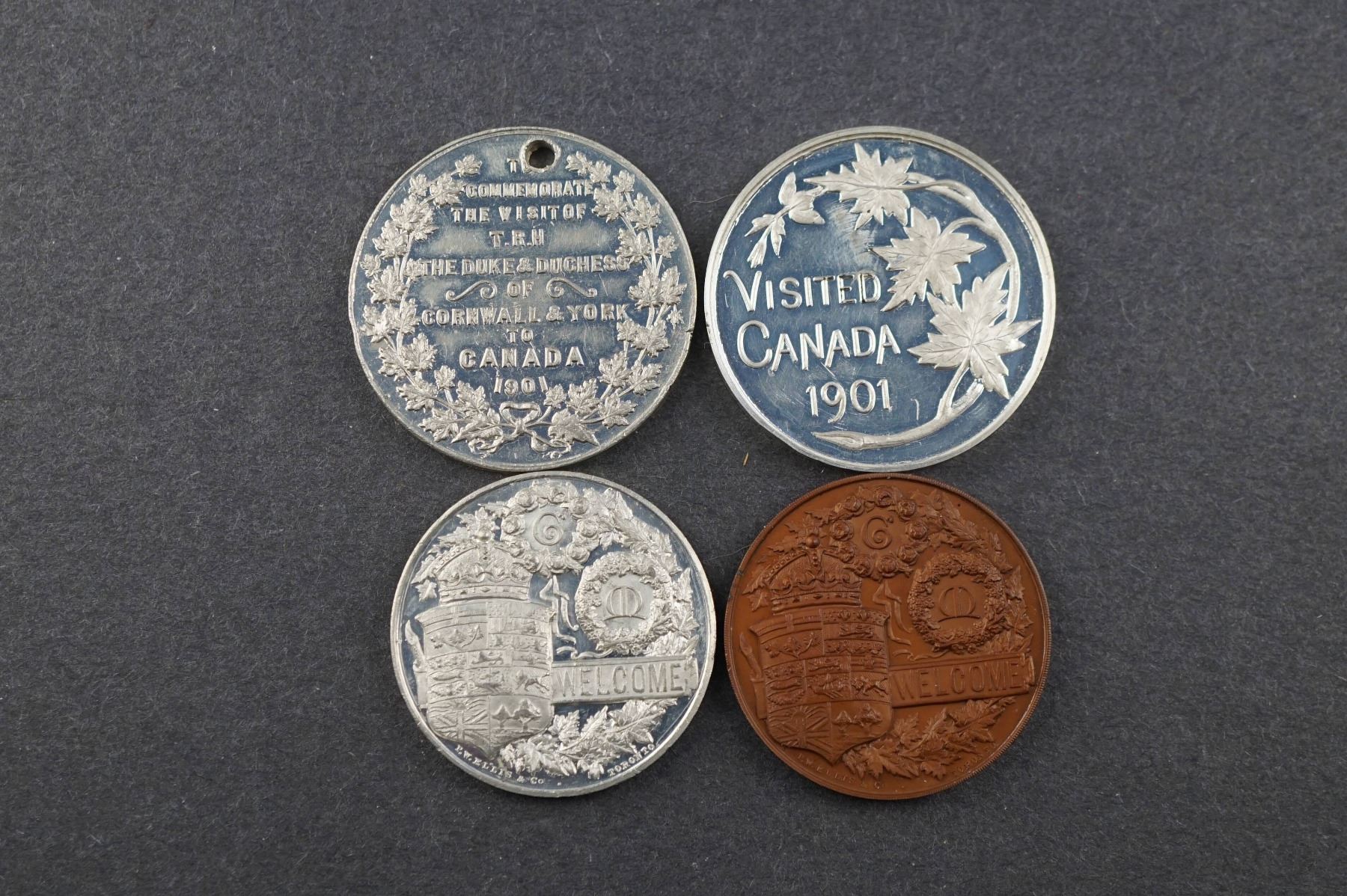 4 Pcs. Visit to Canada Conjoined heads w/Visited Canada. EF, AL-38, 15.7 grs, Conjoined heads w/Cornwall and York. EF, WM-38, 18.3 grs. Pierced & Conjoined heads w/Welcome by P. W. Ellis. FDC, AE-35, 20.9 grs and WM-35, 15.3 grs. Nice Grouping!