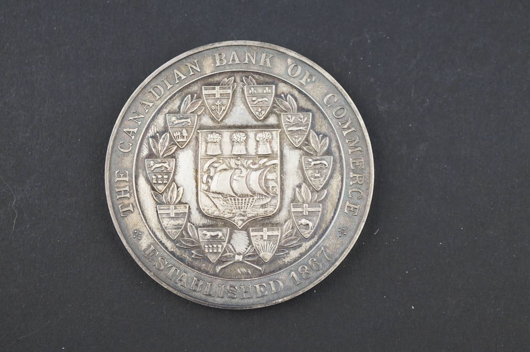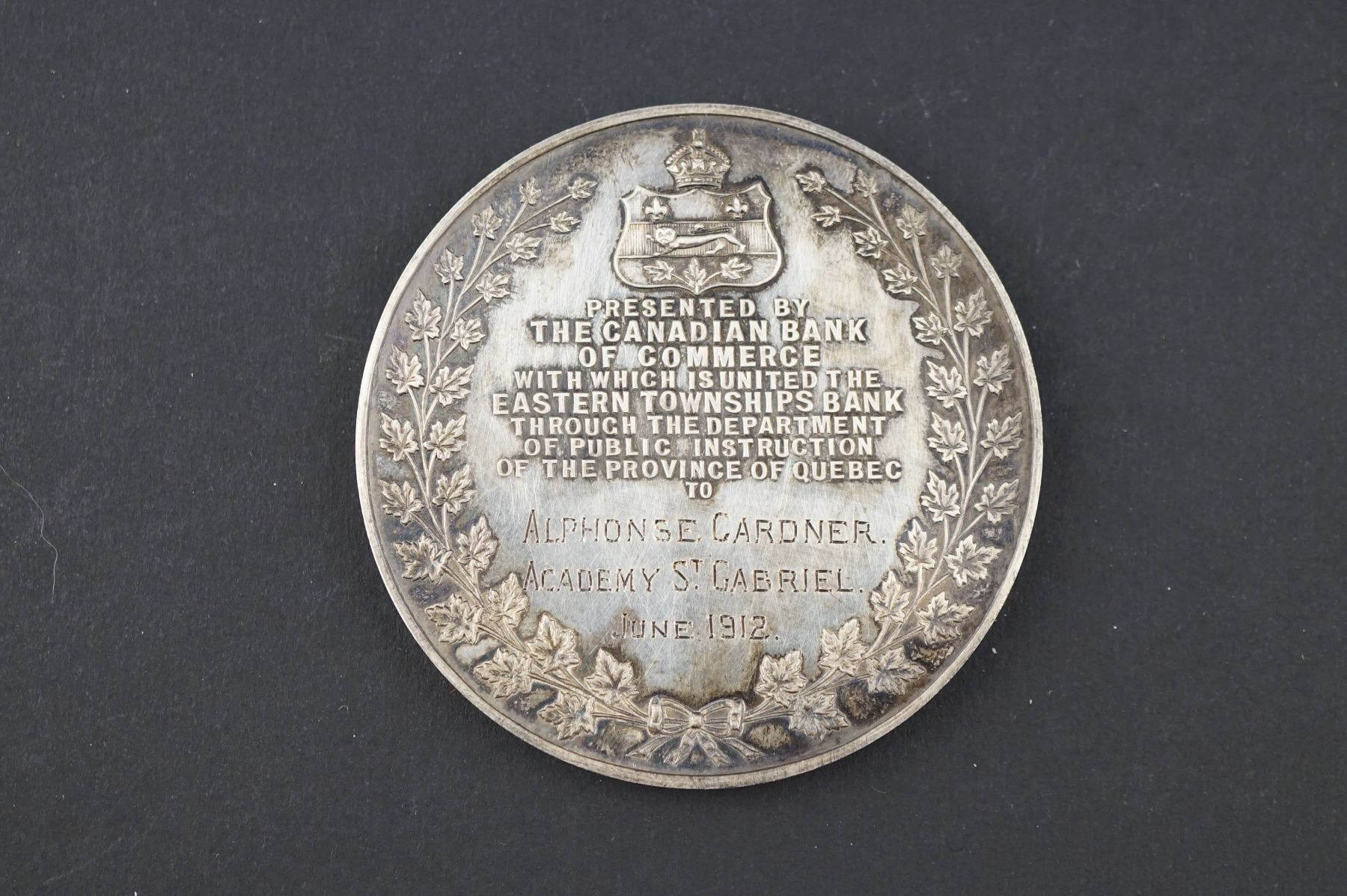 Canadian Bank of Commerce Award for Public Instruction named to Alphonse Gardner, Academy of St-Gabriel. FDC AR-57, 85.9 grs. edge: Plain. Note: First year of the absorption of the Eastern Townships Bank and is mentioned on the medal.