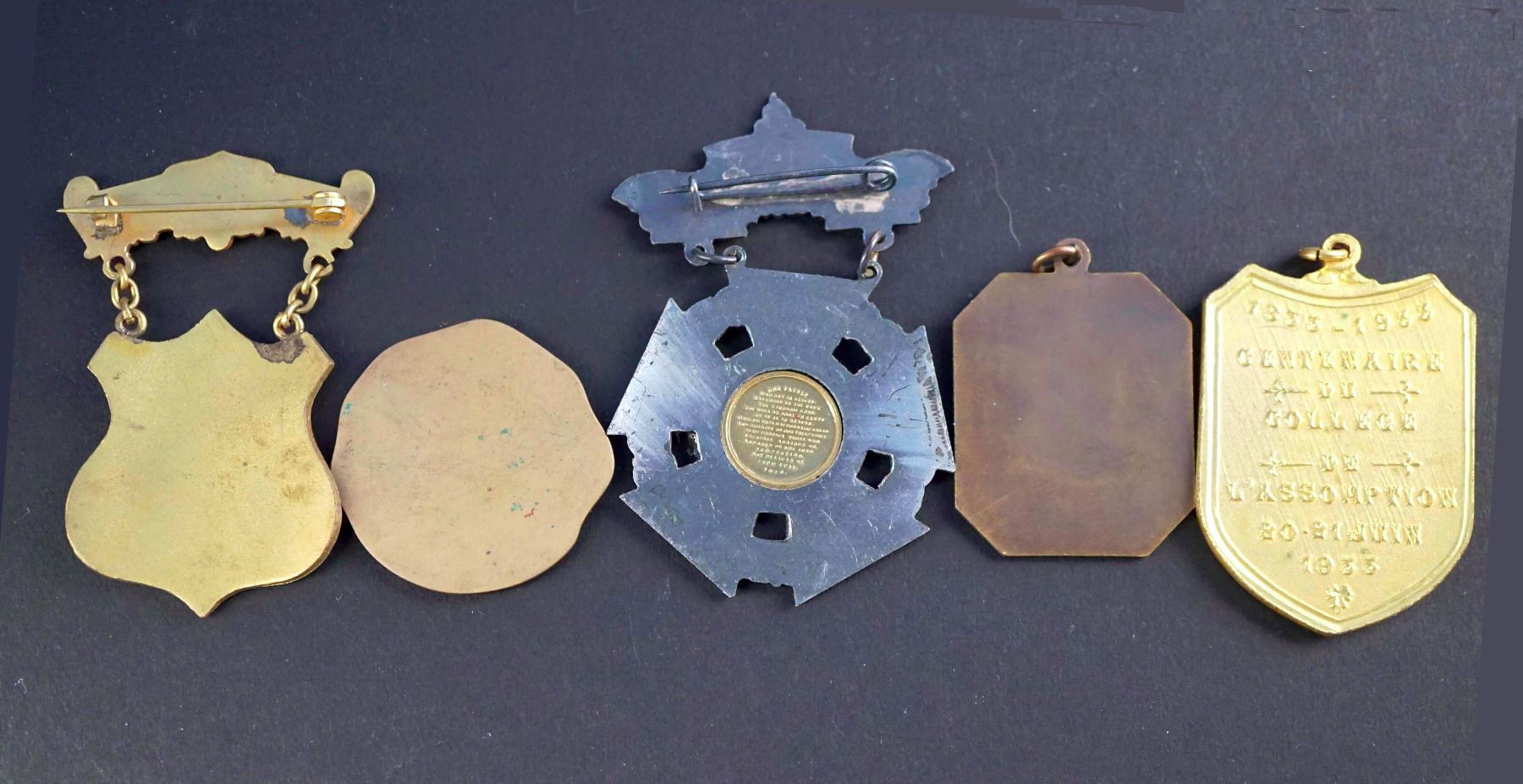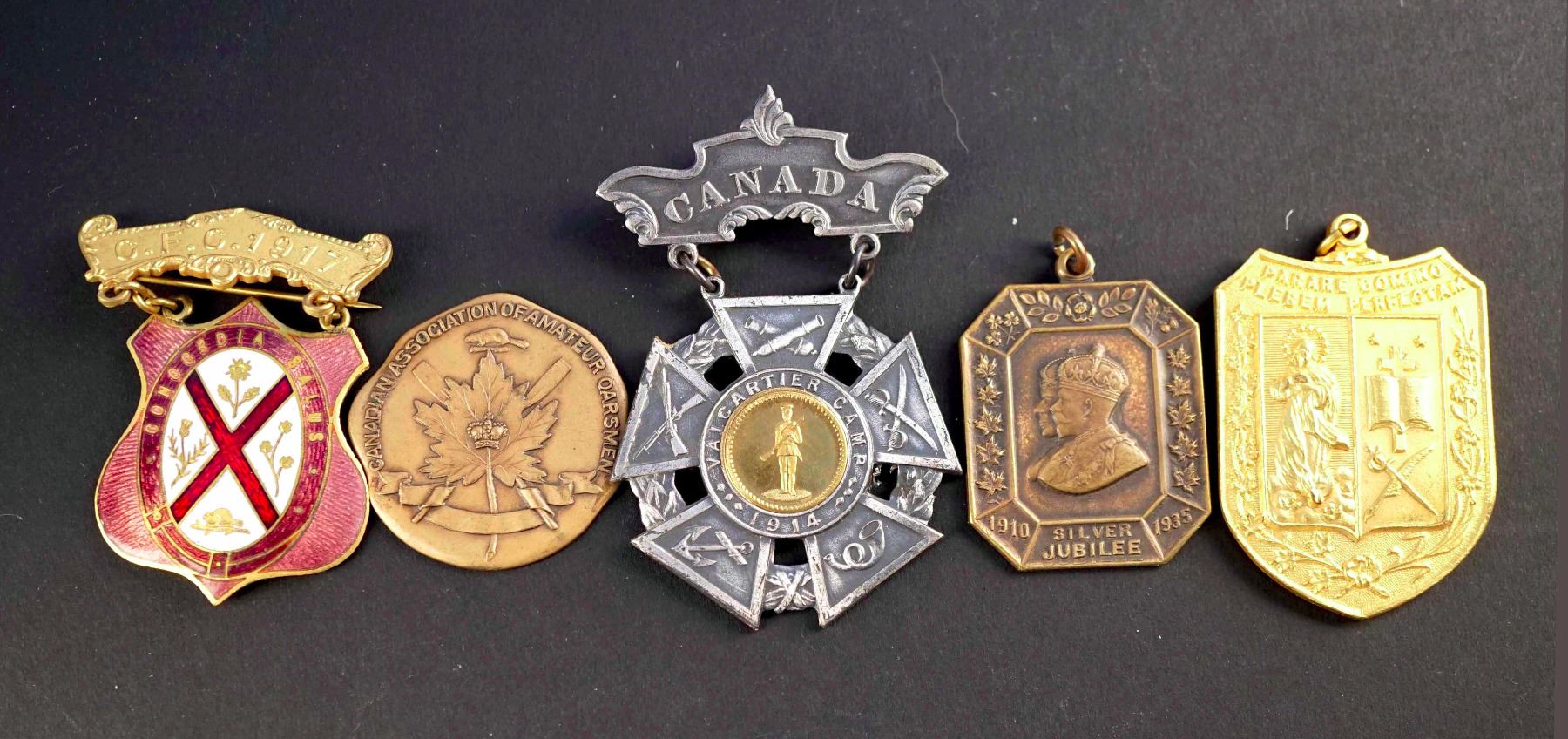 5 Pcs. Valcartier Camp w/header, Montréal shield w/hanger, Rowing Canada. AE-37, Edward & Georges 25 years reign w/loop and 1955 Collège de L'Assomption 48 x 32 mm. shield w/loop. Should be viewed.