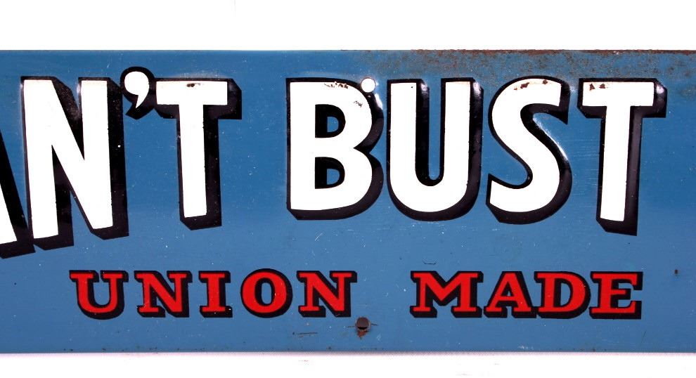This is an original Can't Bust 'Em Union Made door push. The door push is made from embossed tin and has two rooster graphic logos. The sign reads "We Feature Can't Bust 'Em Overalls Union Made". This is a RARE and desirable piece rarely seen. The door push is in good overall condition with great graphics and little wear. It measures 3" x 30.25".