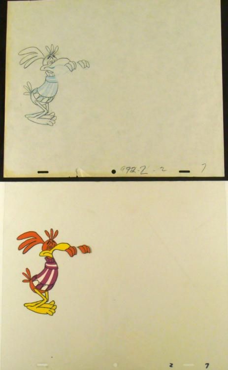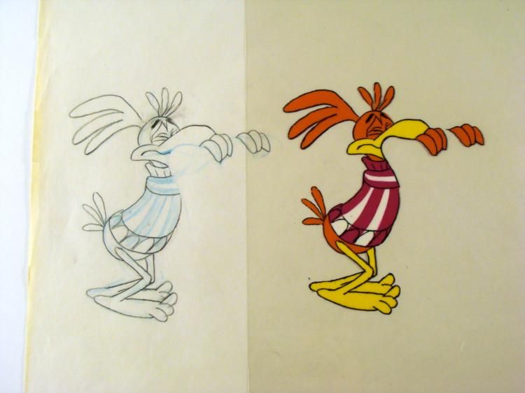 Please don't let me see what you're doing, it's painful to watch... * Original Cel and Drawing * * AnimationOriginal "rough" drawing in black and * non-photo blue pencil with the notations in black and non-photo * blueOverall size is a 12-field drawing that is 10 * 1/2" x 12 1/2"Size of cel: 10 1/2" x 12 * 1/2"Excellent condition * This is an original * hand-painted cel used in the production of * the "Coco Puffs" TV commercial. Each cel represents a slight * change in position of the characters. When individually photographed and * projected in rapid succession, the images appear to move.To * create production cels, the original animator's drawing is transferred * onto an acetate cel (by hand-inking and/or photo copying). The cel is * then hand-painted on the reverse side. * * * The drawing and cel are ready to be matted and * framed. The animator's notations are located at the bottom of * both. *
