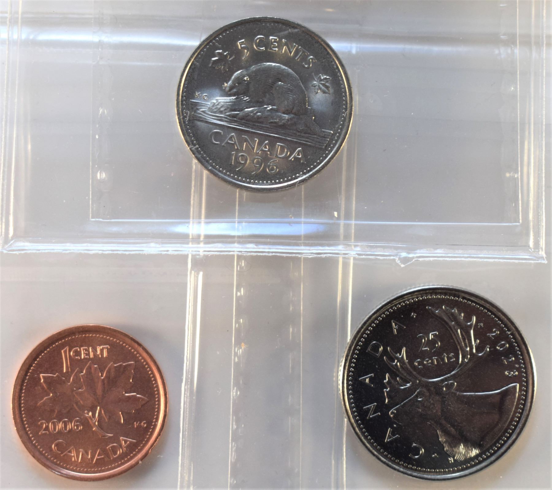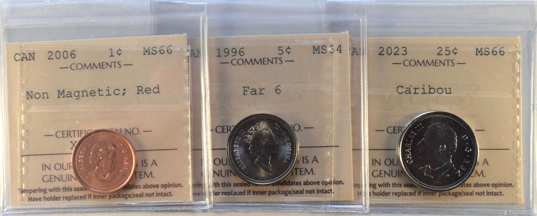 Canada, 0.01c 2006 Non Magnetic MS-66 Red, 0.05c 1996 Far 6 CuNi MS-64 and 0.25c "Caribou" 2023 New King Charles III MS-66 all ICCS Certified (3)