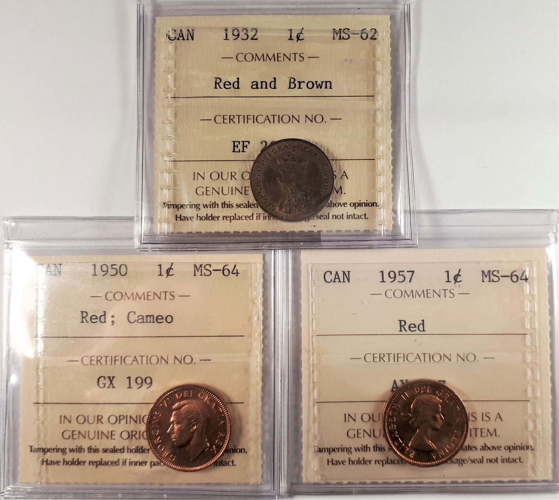 Canada, 0.01c Trio 1932 in MS-62 RB, 1950 MS-65 Red Cameo and 1957 MS-64 Red all Certified ICCS (3)