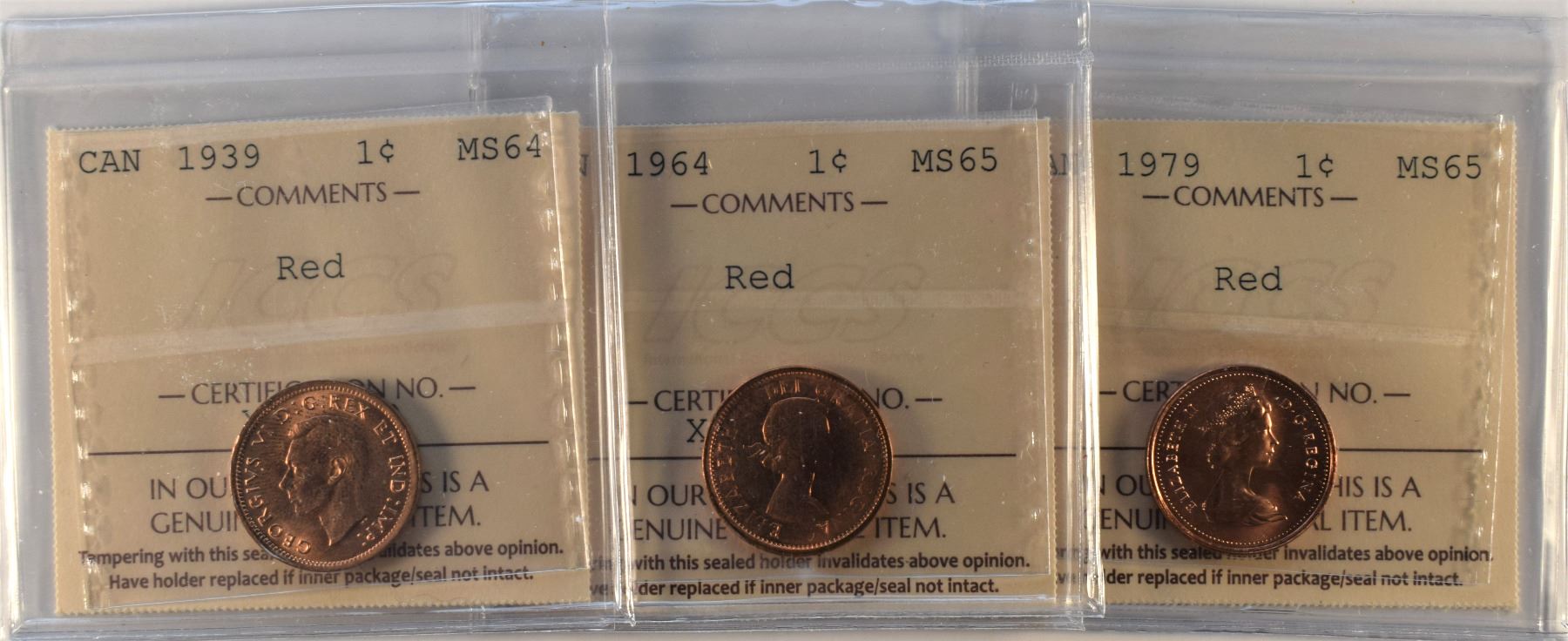 Canada, 0.01c X 3 / 1939 MS-64 Red, 1964 and 1979 both MS-65 Red all ICCS Certified (3)