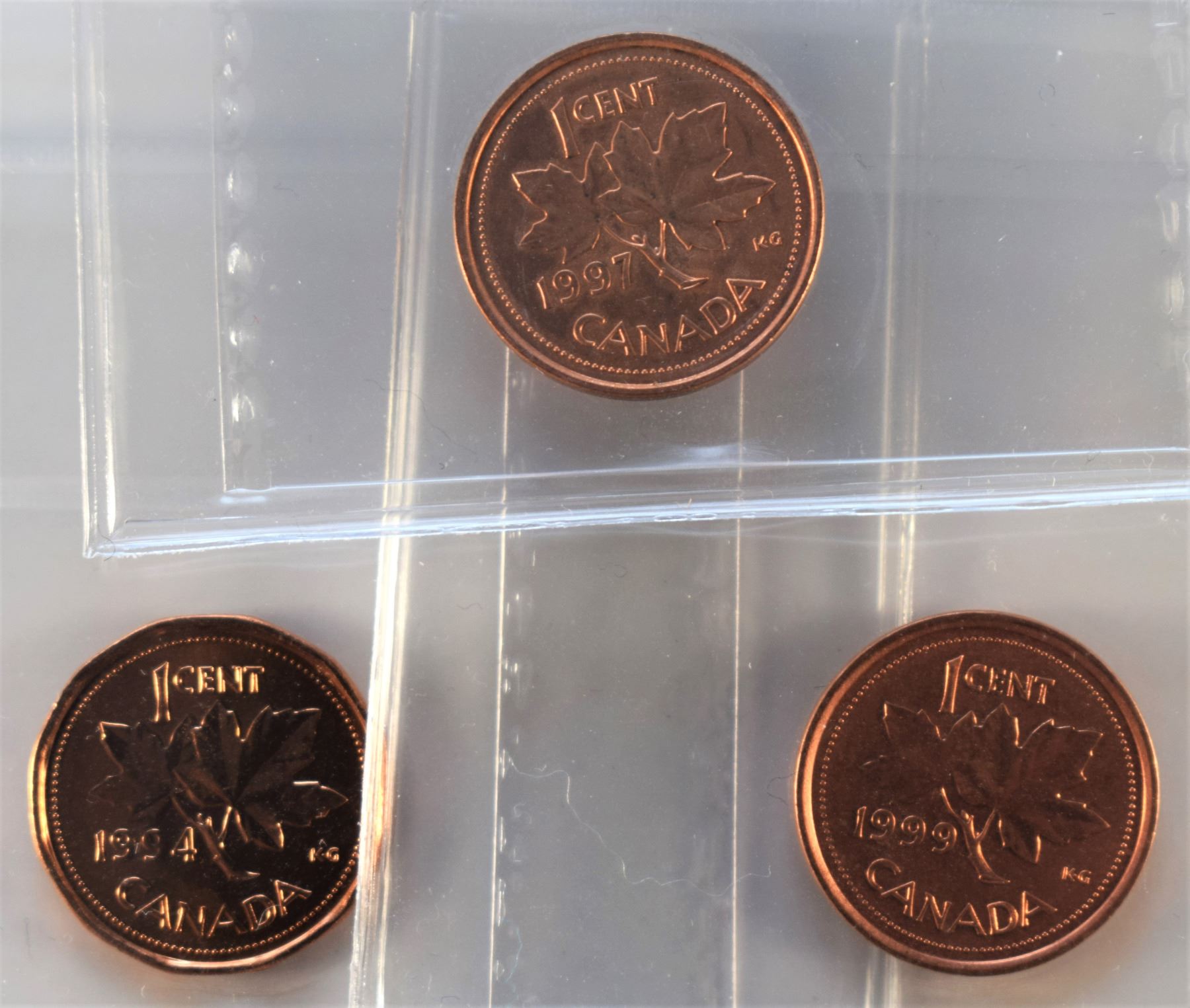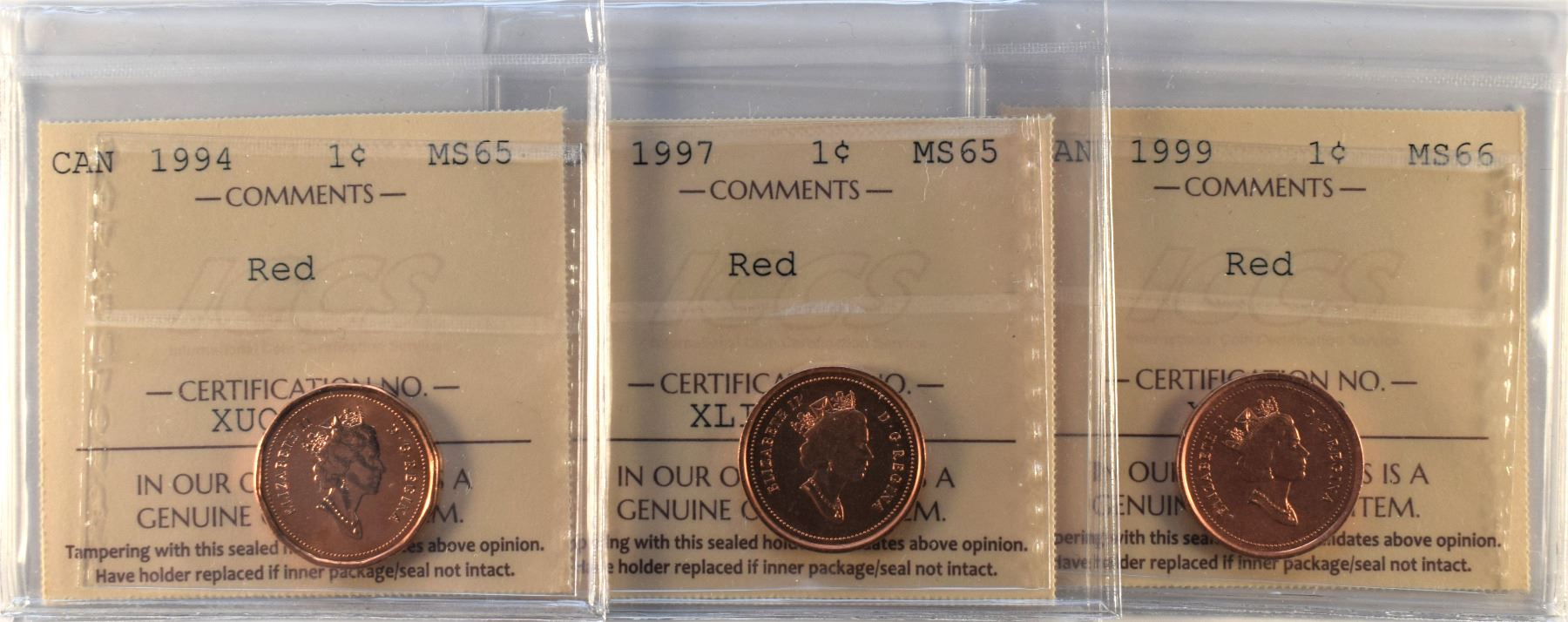 Canada, 0.01c X 3 / 1994 and 1997 both MS-65 Red and 1999 MS-66 Red all ICCS Certified (3)