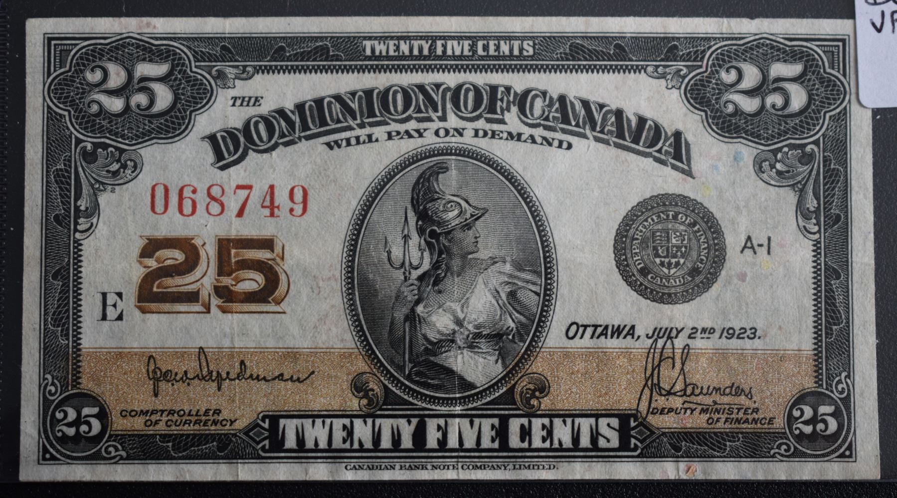 Canada, 0.25c 1923 "Dominion of Canada" DC-24b Serial # 068749 in VF-30 Grade.