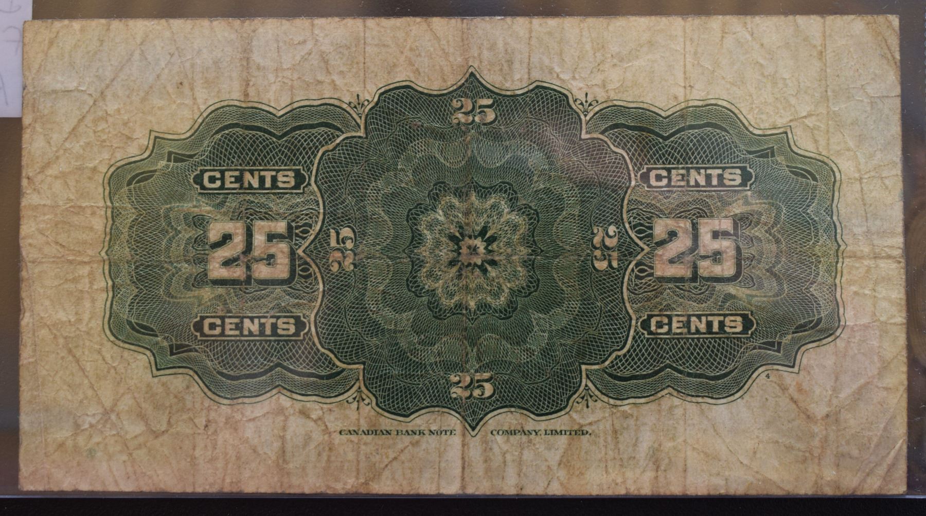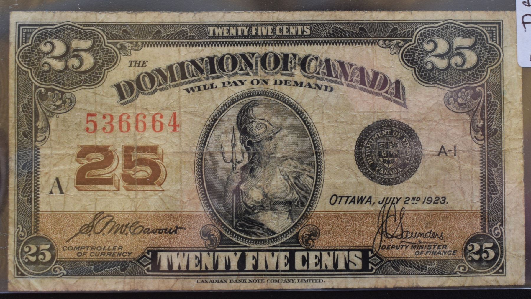 Canada, 0.25c 1923 "Dominion of Canada" DC-24c Serial # 536664 in Fine F+ Grade.