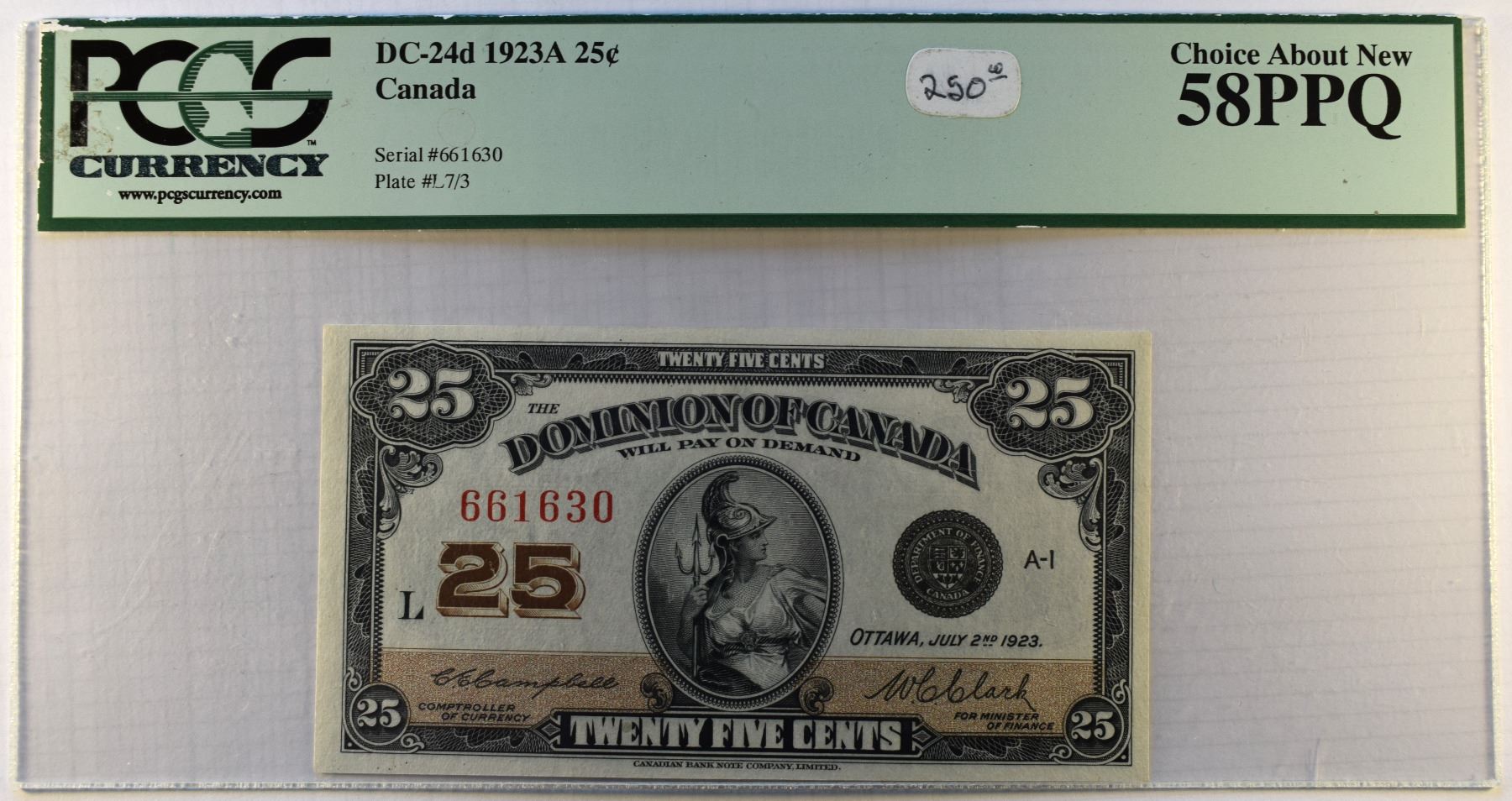 Canada, 0.25c 1923 "Dominion of Canada" DC-24d Serial # 661630 Choice A-UNC-58 PPQ Cert. PCGS