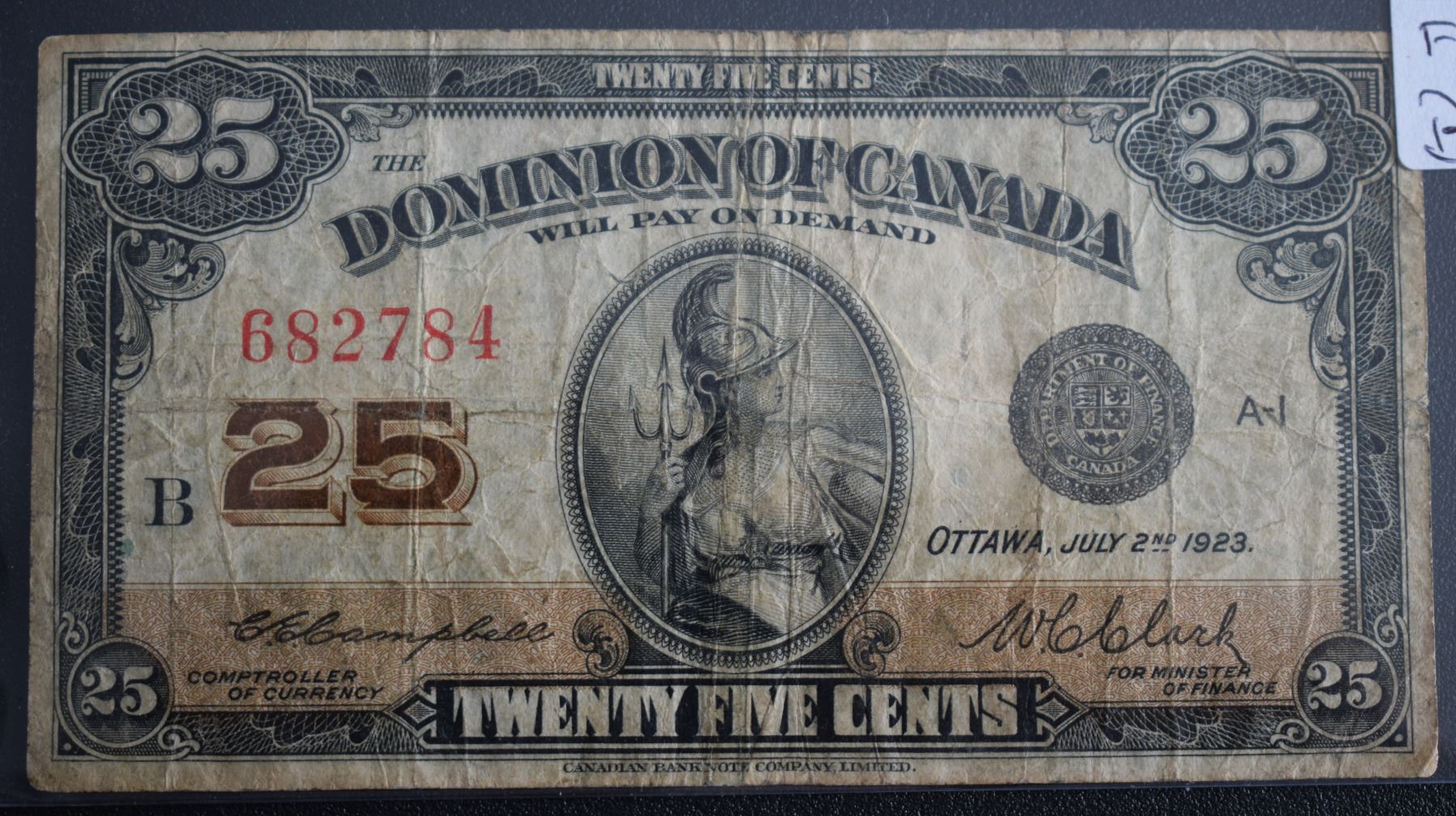 Canada, 0.25c 1923 "Dominion of Canada" DC-24d Serial # 682784 in Fine F+ Grade.