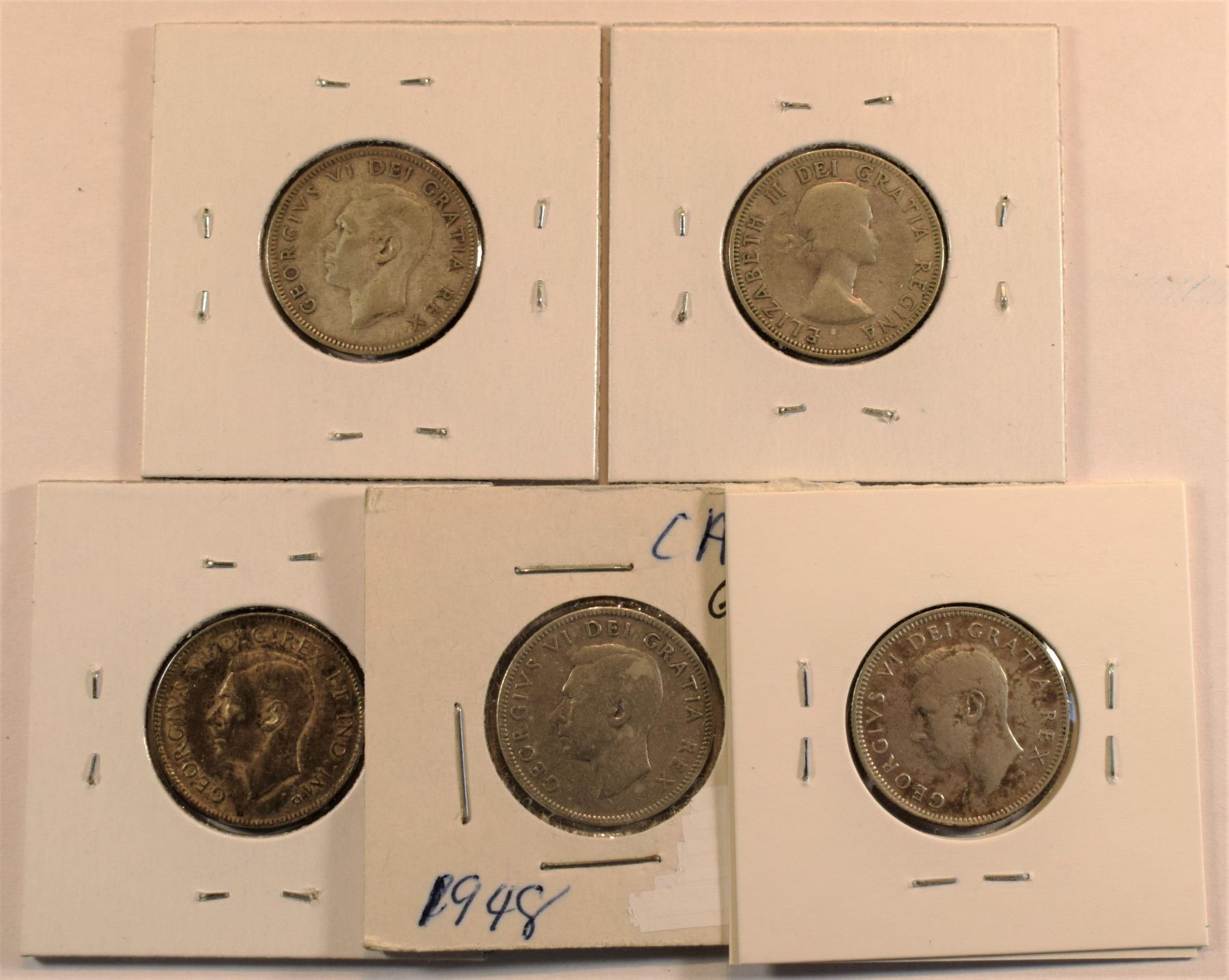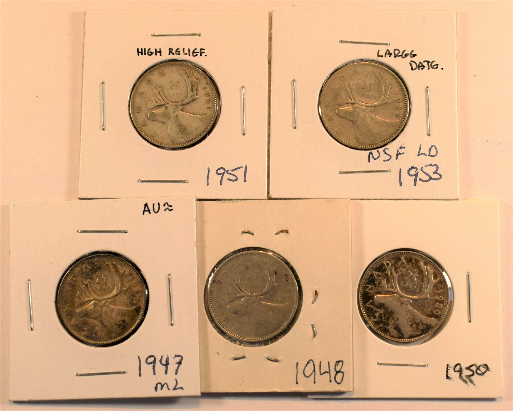 Canada, 0.25c x 5 1947ML-48-50-51 High Relief and 1953 NSF Large Date All Silver Grades from VG/F to AU+, Nice Group for beginners. ASW 0.75 Oz (5)