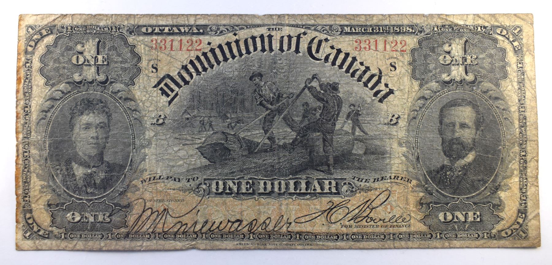 Canada, 1$ 1898 "Dominion of Canada" DC-13c Fancy Serial # 331122 (S) Boville in VF Net Grade.