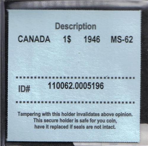 Canada 1$ 1946 MS-62 C.C.C.S. CERT.