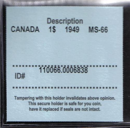 Canada 1$ 1949 MS-66 C.C.C.S. CERT.