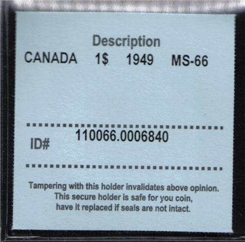 Canada 1$ 1949 MS-66 C.C.C.S. CERT.