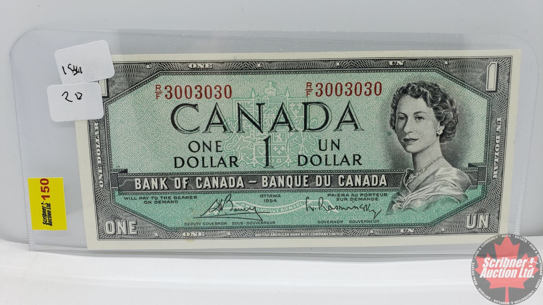 Canada $1 Bill 1954 (2 Digit Serial Number) (Bouey/Rasminsky RF3003030) (See Pics for Signatures/Serial Numbers)
