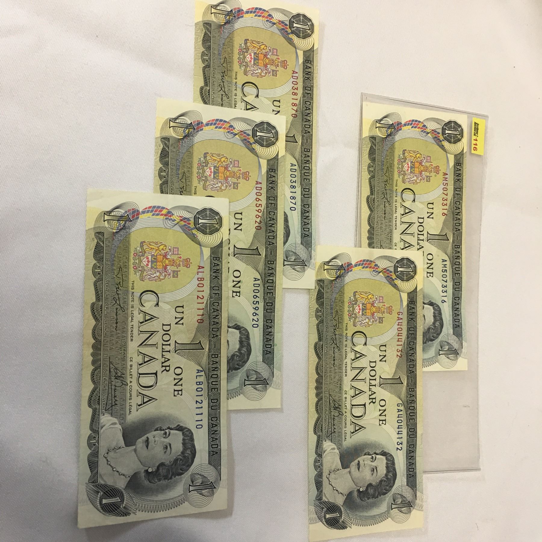 Canada $1 Bill 1973 - Set of 5: AM5073316; GA4044132; AD0381870; AD0659620; ALB0121110