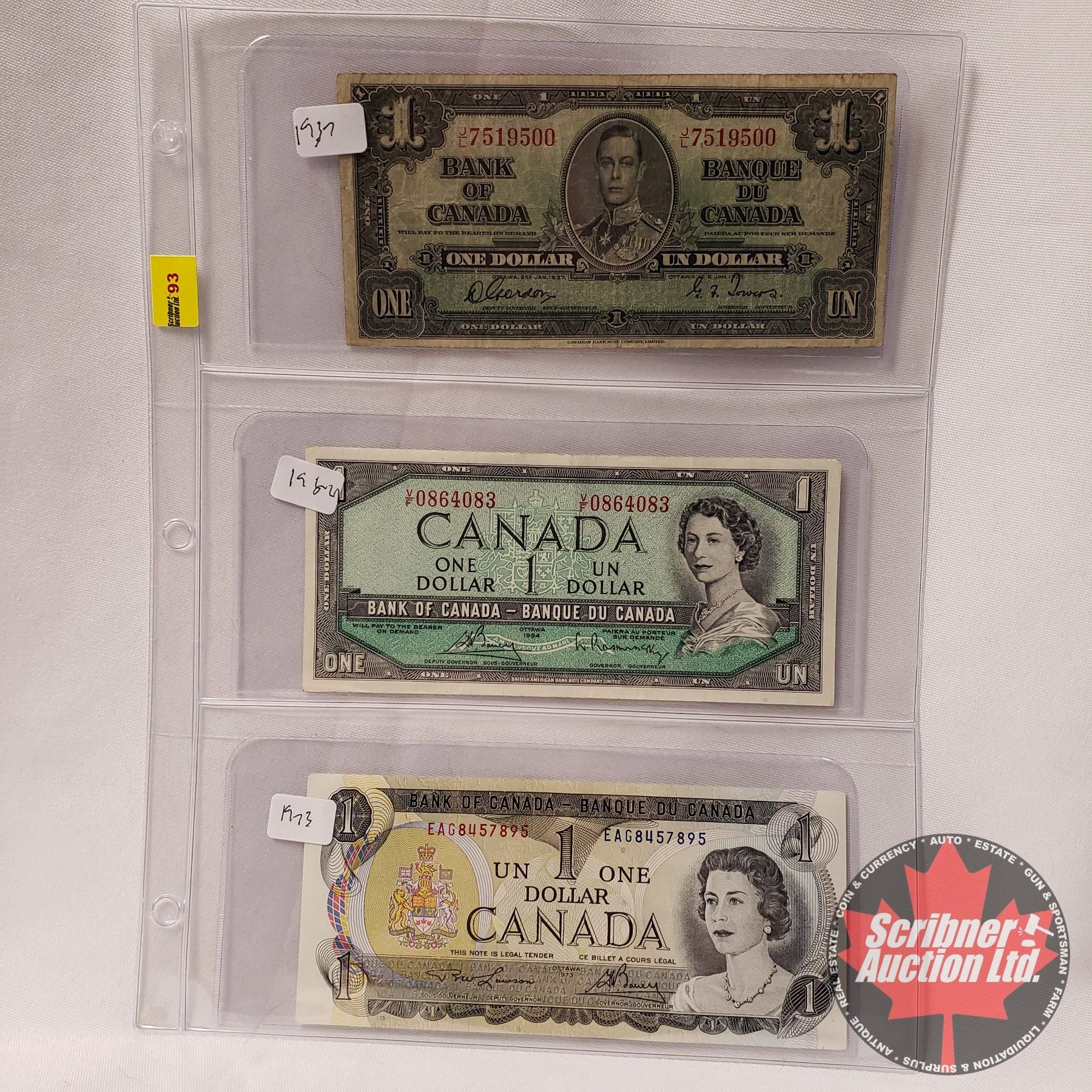 Canada $1 Bills (3): 1937 ; 1954; 1973 (See Pics for Signatures/Serial Numbers)