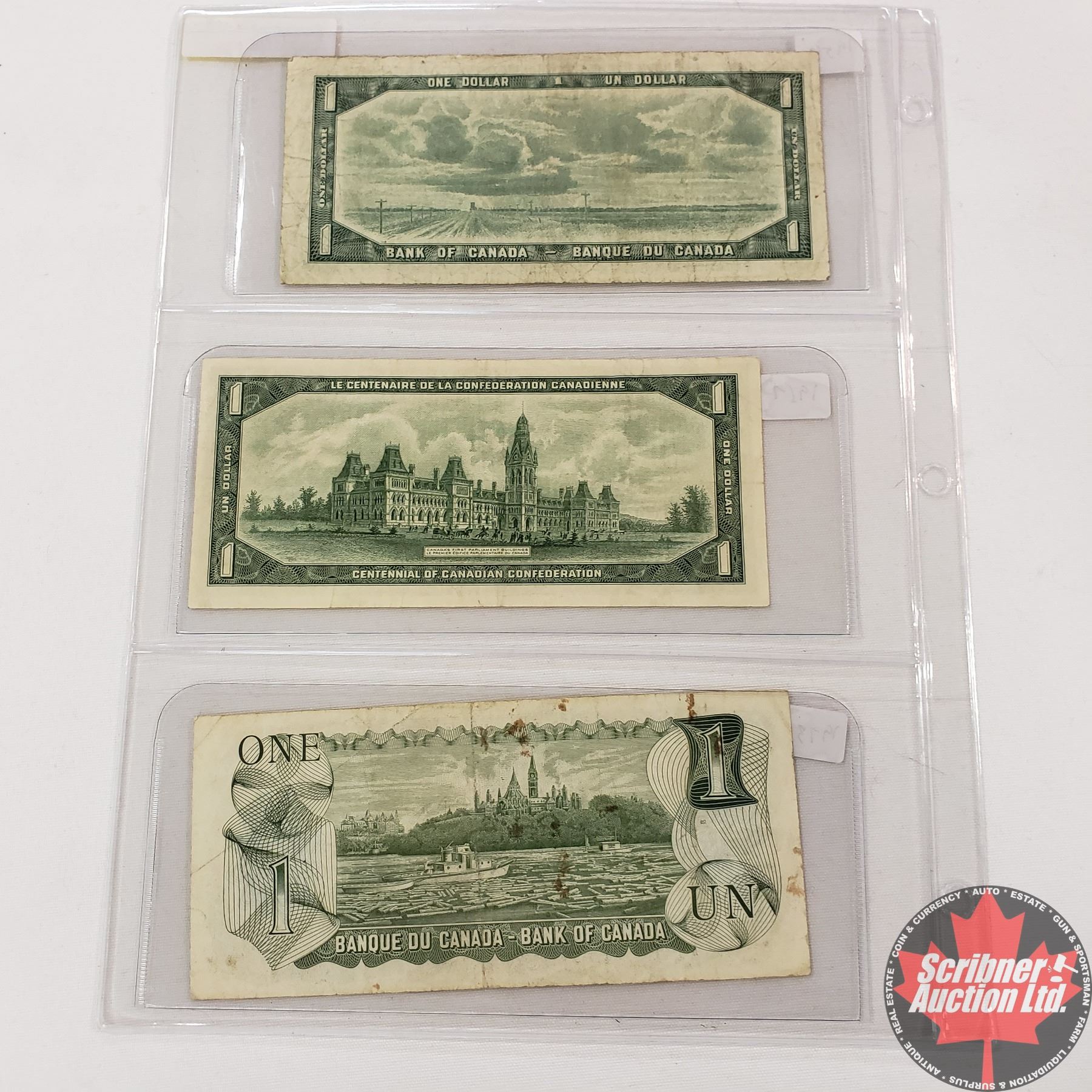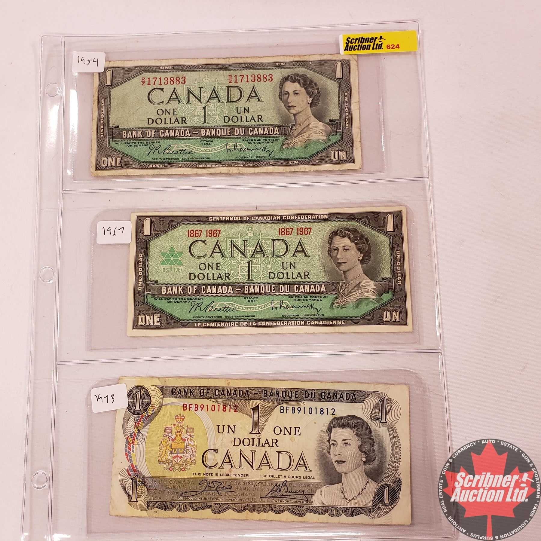 Canada $1 Bills - Sheet of 3: 1954 (Beattie Rasminsky RZ1713883) ; 1967 (Beattie/Rasminsky No S/N#) ; 1973 (Crow/Bouey BFB9101812)