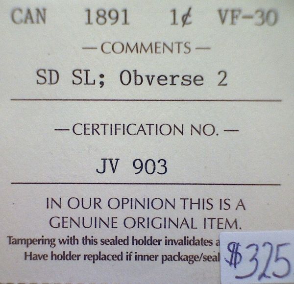 Canada - 1 Cent - 1891 - SD SL; Obv #2 - ICCS - VF-20