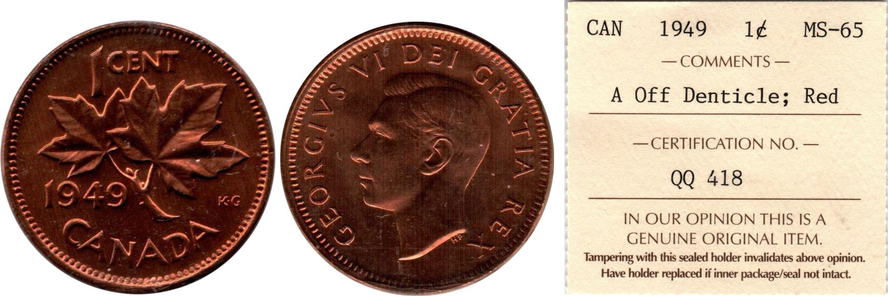 1949 1 Cent MS64 Red. Graded by ICCS. This is the A between Denticles (A off Denticle) variety. Coin is nearly full red.