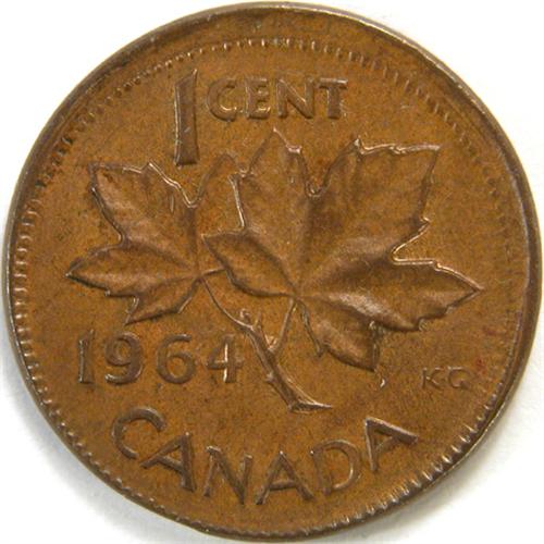 1 Cent 1964 Broadstrike, off centre toward 4 o’clock, Brown Uncirculated with traces of red