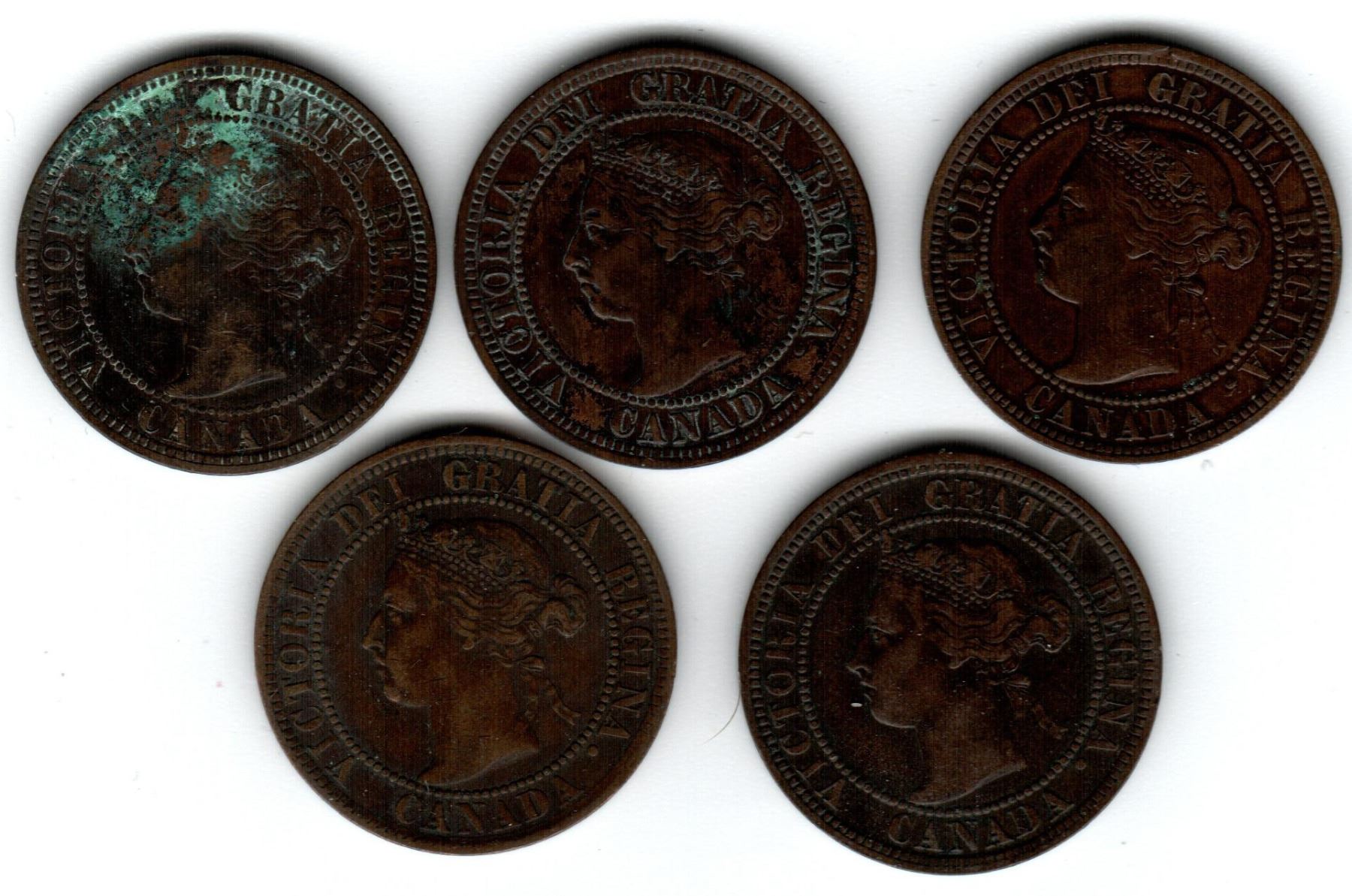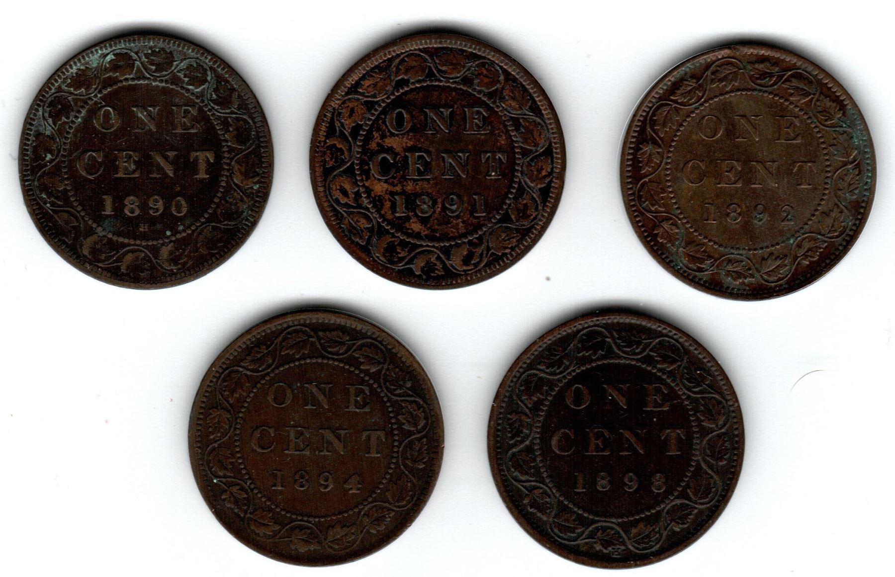 Lot features one of each of 1890H; 1891 Large Leaves, Large Date; 1892; 1894 (Large 4); 1898H. All coins are VF. Corrosion on Obverse of 1890, mentioned for accuracy.