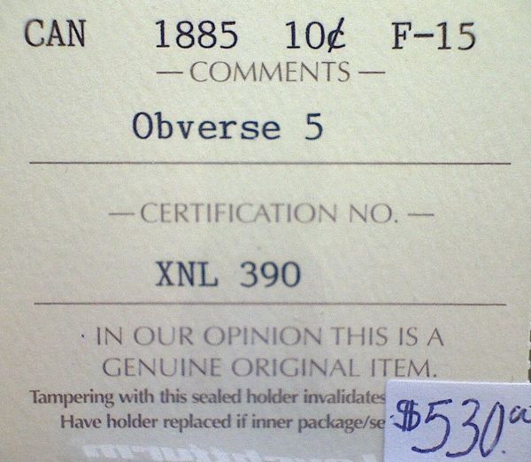 Canada - 10 Cents - 1885 - Obverse #5 - ICCS - F-15