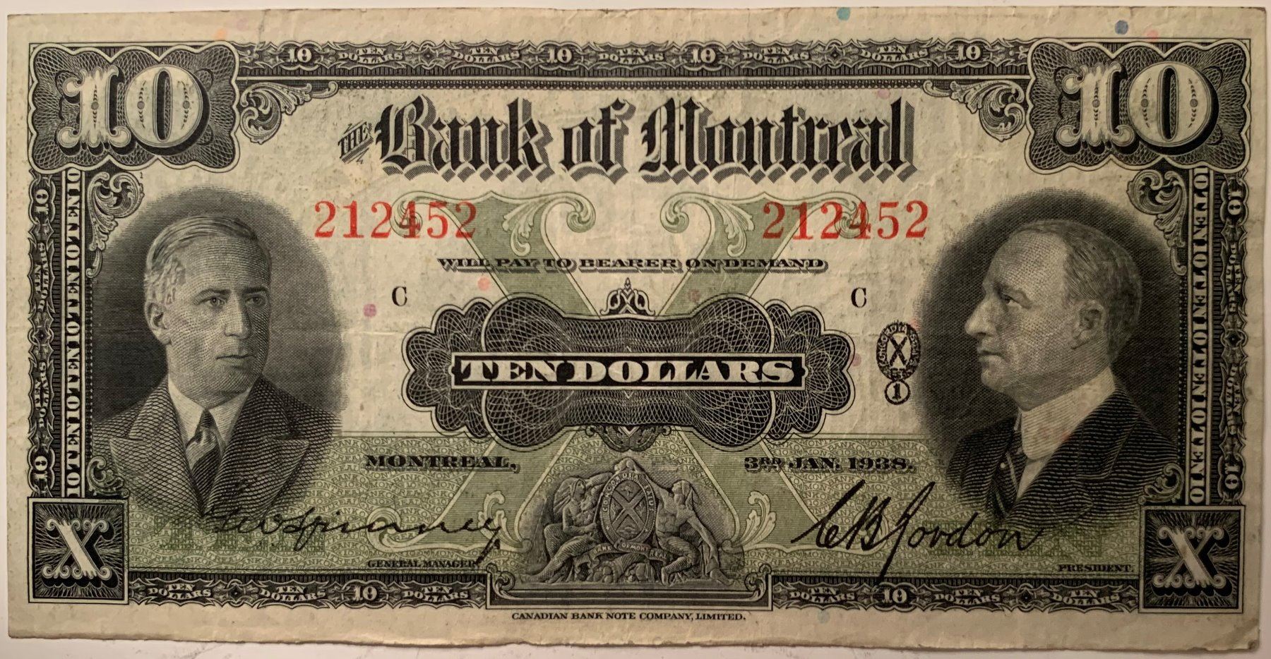 Canada 10 Dollars 1938 Bank of Montreal $10 Serial 212452