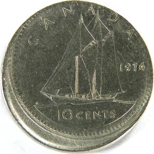 Canada Ten Cents 1974 Struck 12% Off Centre.with a small “Ball Cap” effect, AU