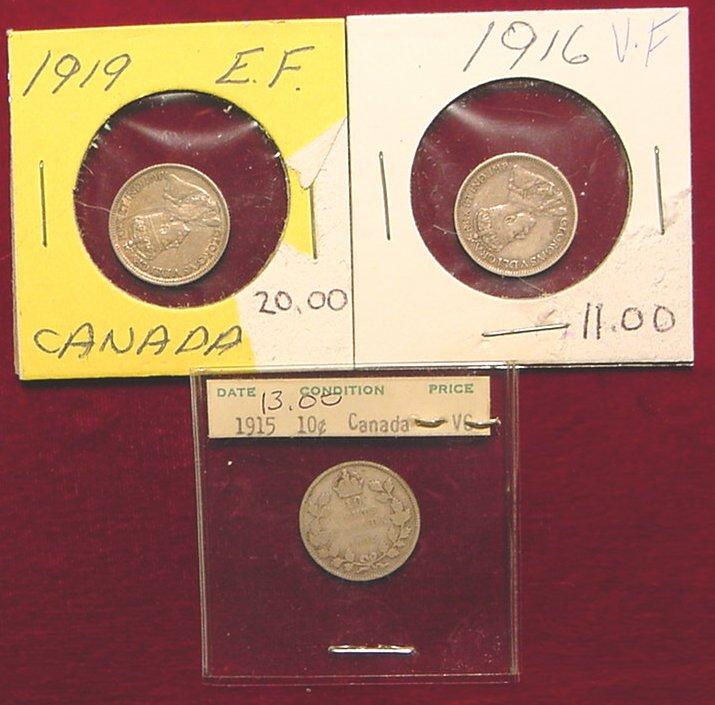 Canada .10c lot. 1915 VG, 16 VF, 19 EF totaling over $40.00 in Charlton Catalog.