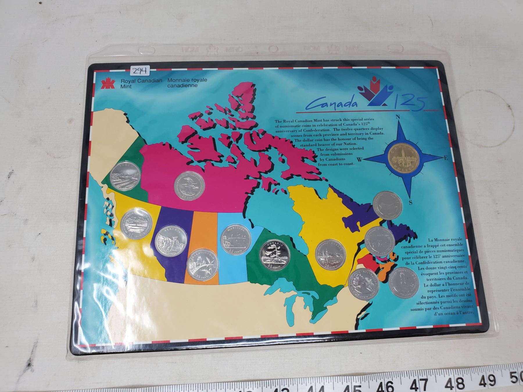 Canada 125 Quarter set in a Large colourful Canadian Map Holder c/w Looney,1-Canada 125 commemorative set
