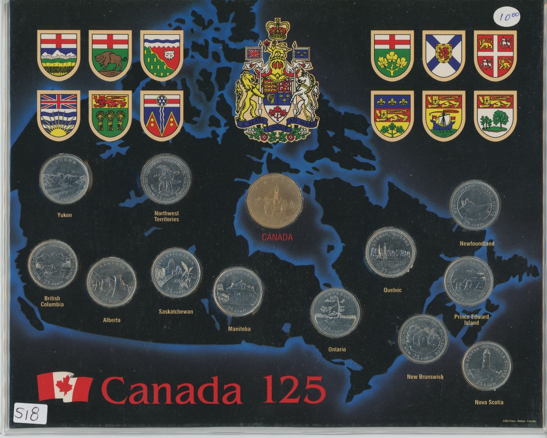 Canada 125 Quarter set in a small Blue Map Holder c/w Looney,1-Canada 125 commemorative set