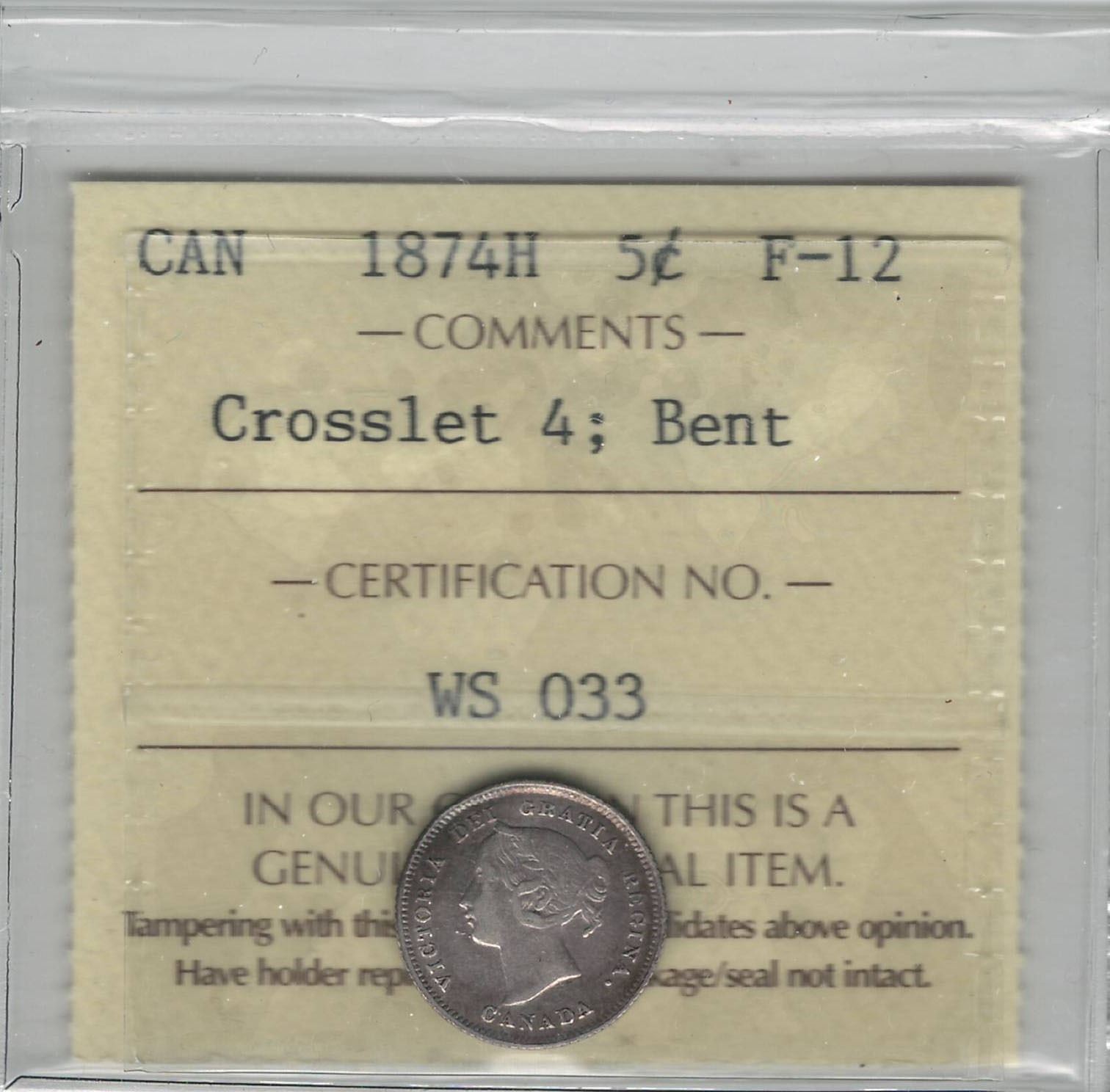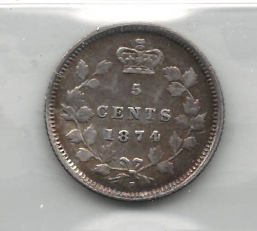 Canada 1874H Silver 5 Cent Crosslet 4 ICCS F12 Bent