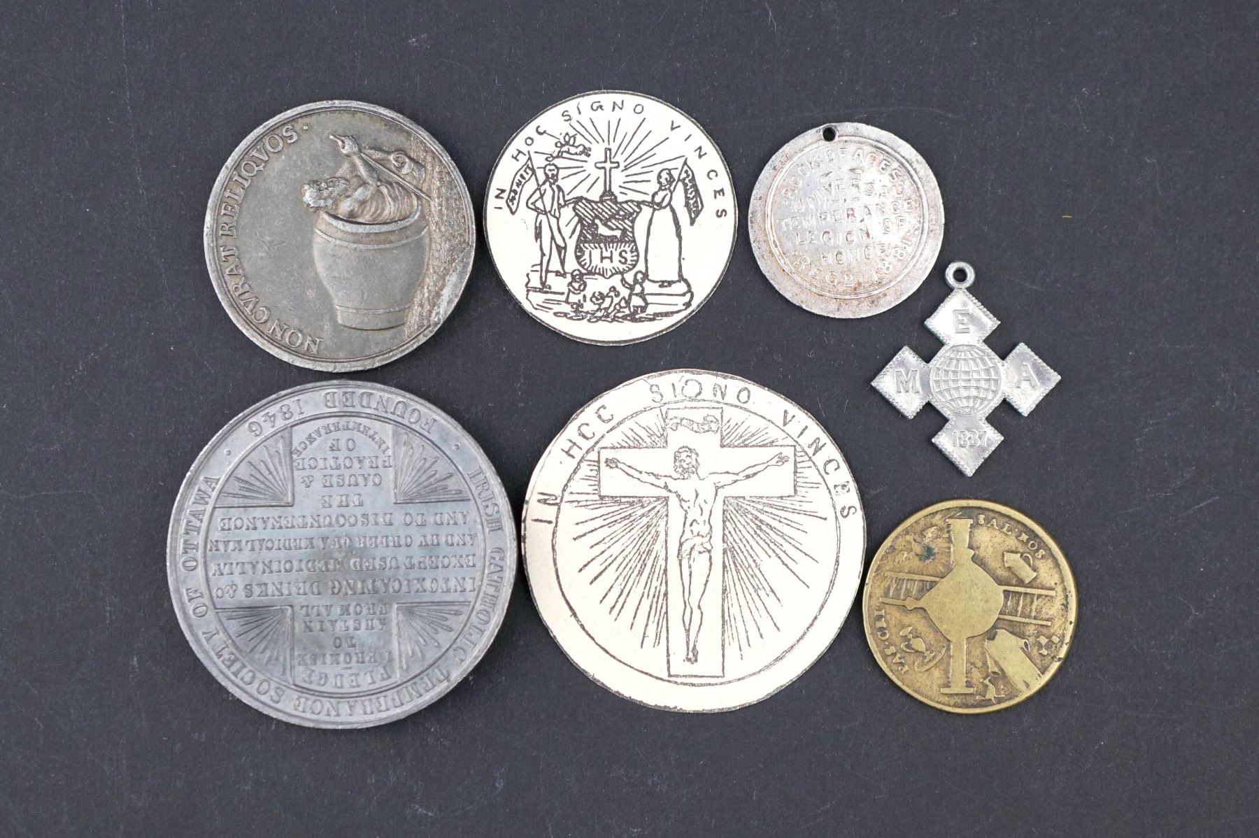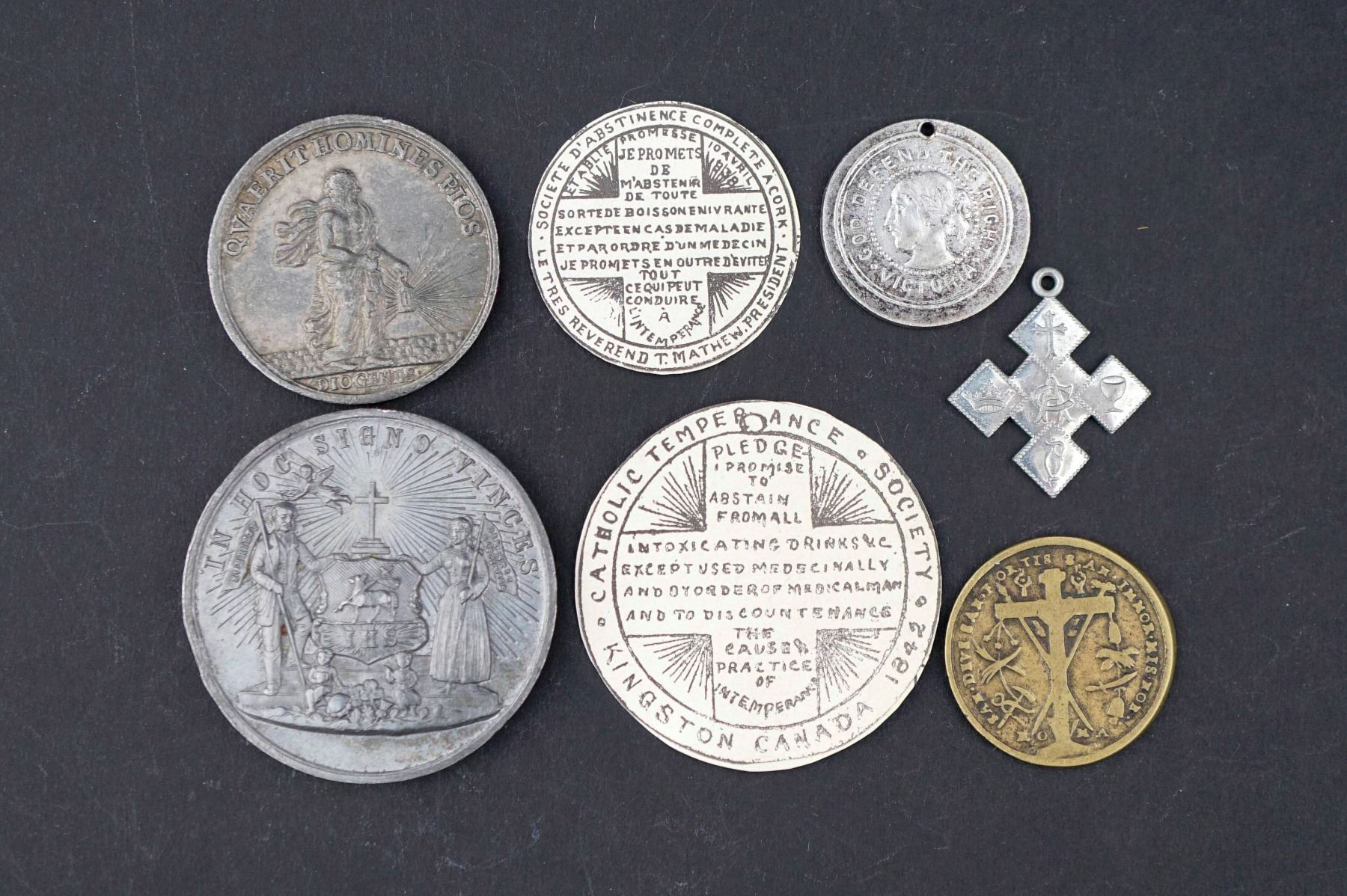 6 pcs. Irish Catholic Temperance Society of Ottawa EF, AE-43, Victorian Temperance League. EF, AR-24, 1 pc. cardboard medals, plus 3 misc. and curious medals