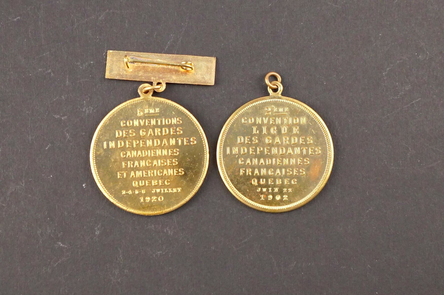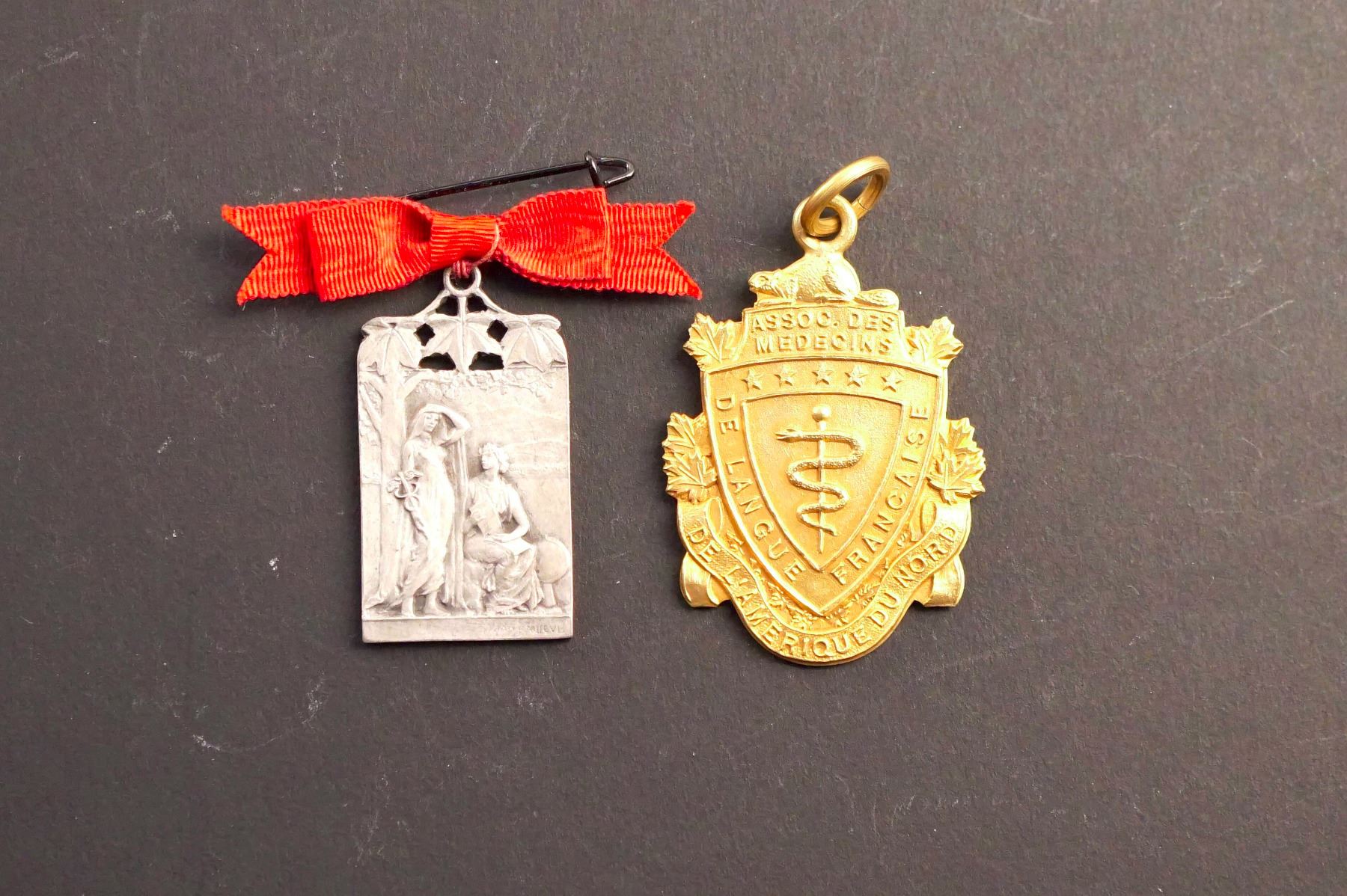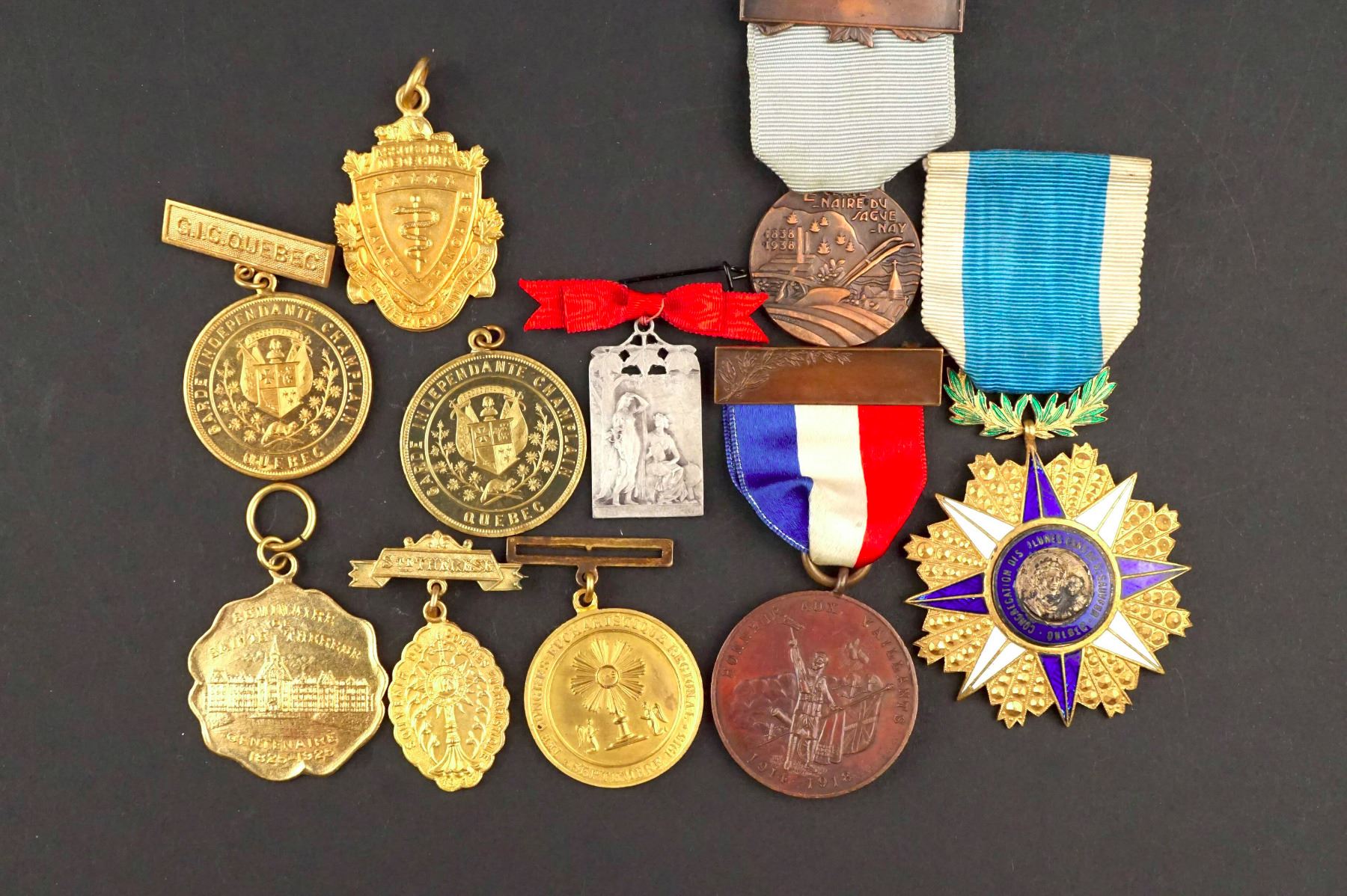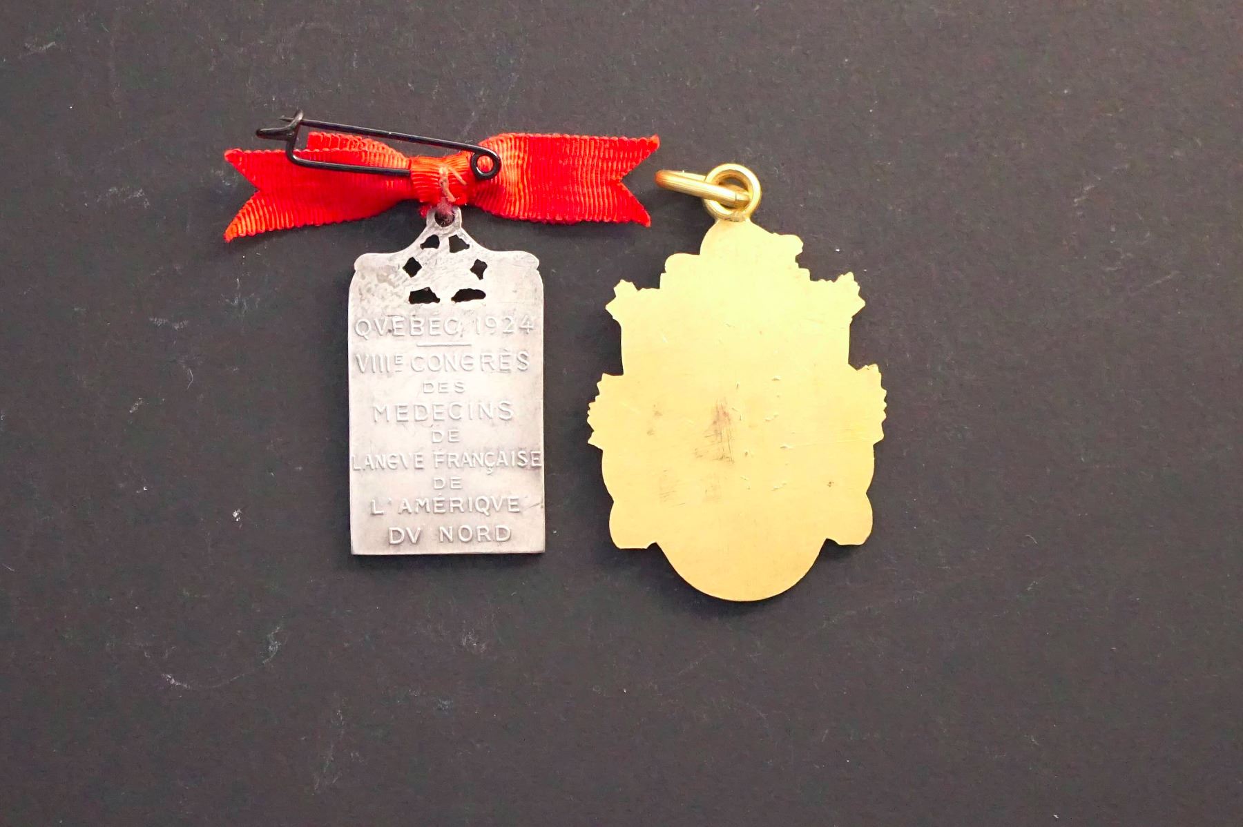 2 Pcs. Assoc. Association des médecins de la langue Française, Shield w/Rod of Asclepius. UNC 42 x 29 mm. 10.9 grs. & 1924 8th Congress in Québec City on a silver looped art deco plaquette by Jean Bailleur (1878-1949) suspended by a red ribbon. Must be viewed. 2 Pcs. Garde Indépendante Champlain 1902, 2nd Convention. UNC, AE-32, 9.0 grs w/loop & 1920 5th Convention. UNC, AE-32 w/hanger and loop 11.9 grs. 3 Pcs. Séminaire de Sainte-Therese Blainville, Qc. First Congress Eucharistic. UNC, AE-31, 11.2 grs w/hanger, same but oval-31 w/hanger & 1925 - 100th Anniversary of the Seminary. AE-34, 10.6 grs w/loop. 3 Pcs. 1919 Salute to the WWI solders by Shawinigan Falls w/header and ribbon by Caron, Young men Congregation of Saint-Sauveur cloistered & 1934 100th Anniversary of Saguenay w/header and ribbon by C. Lemond.