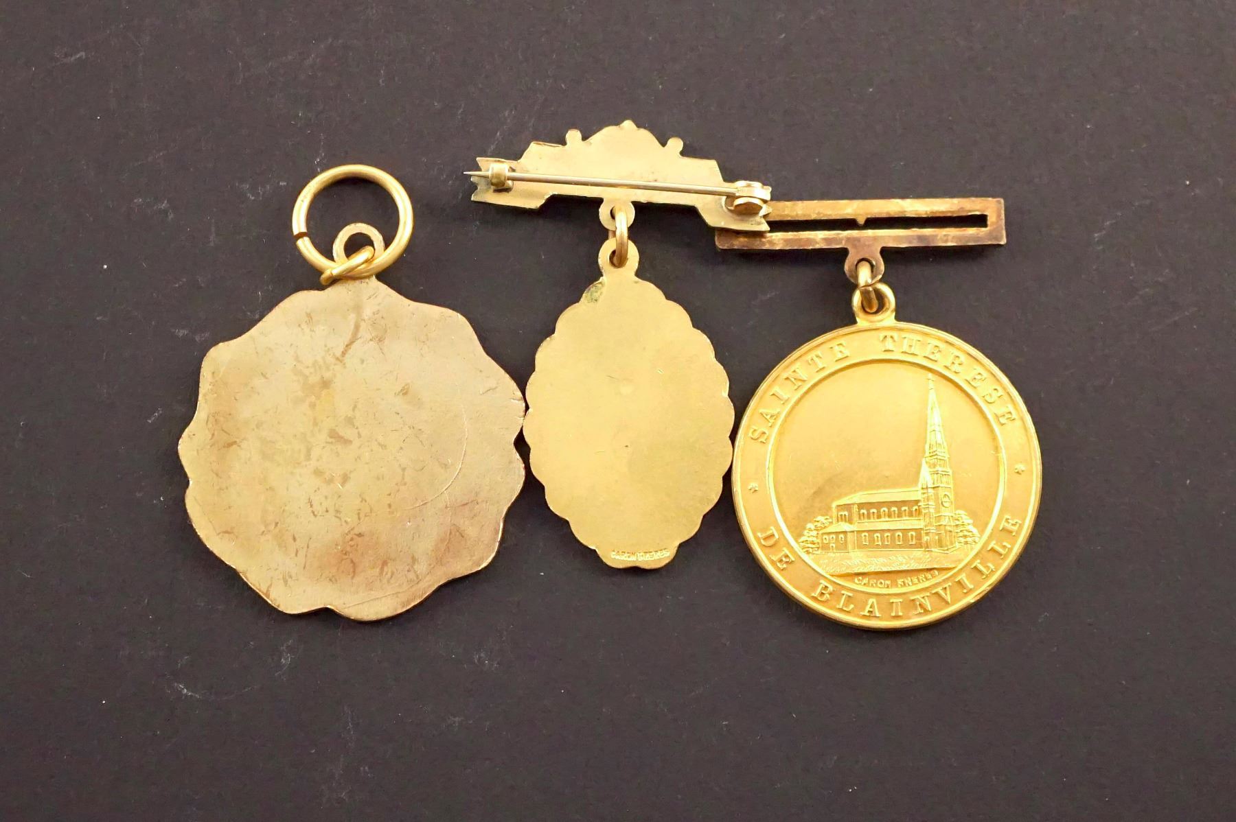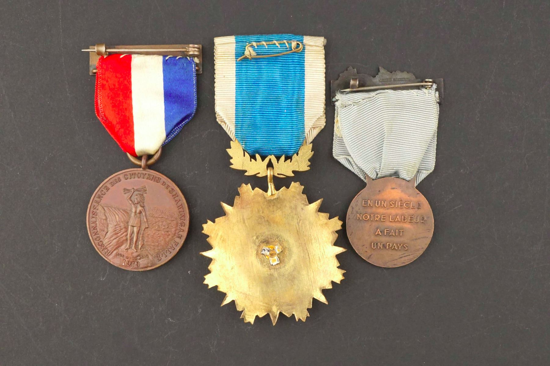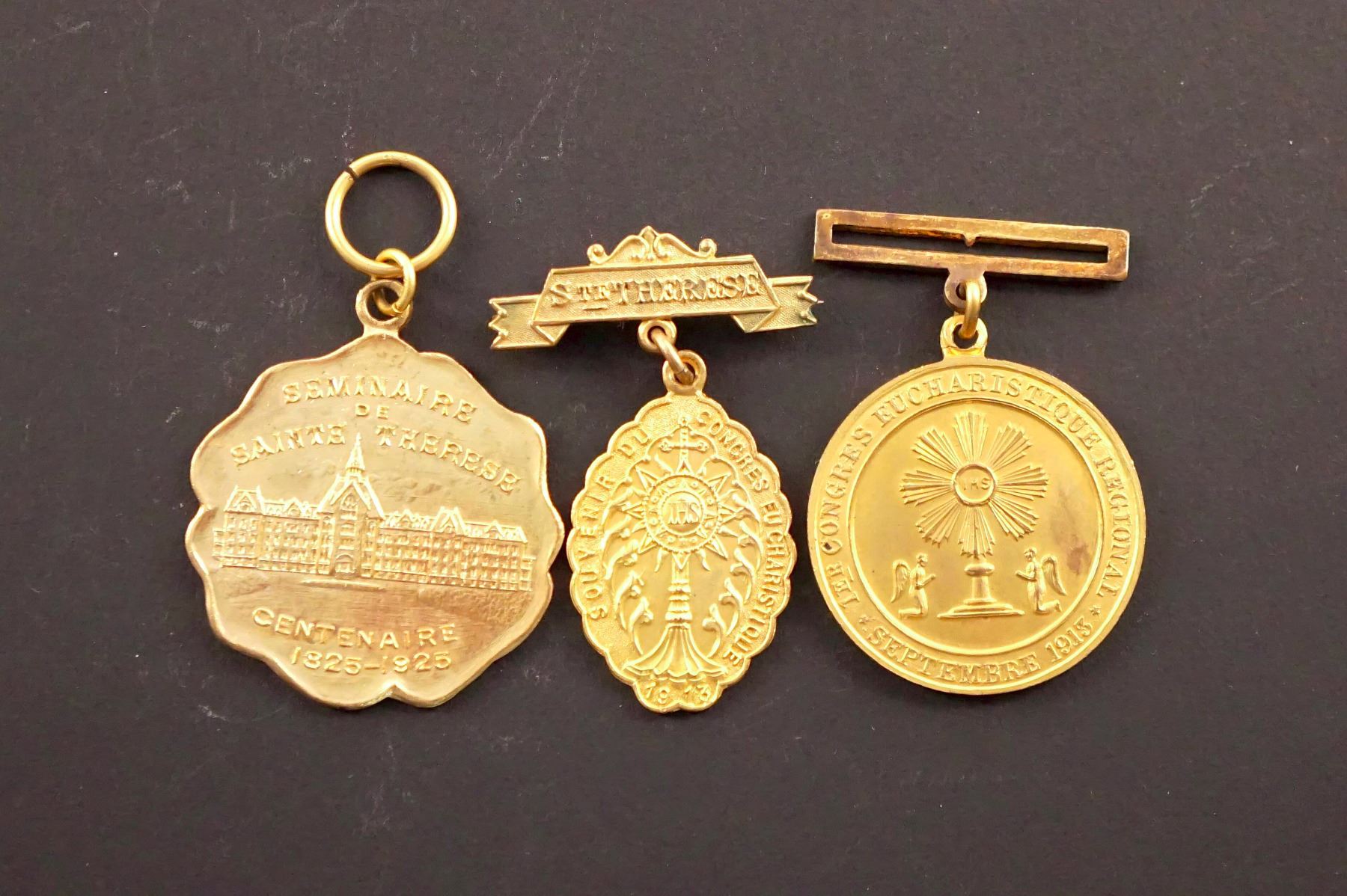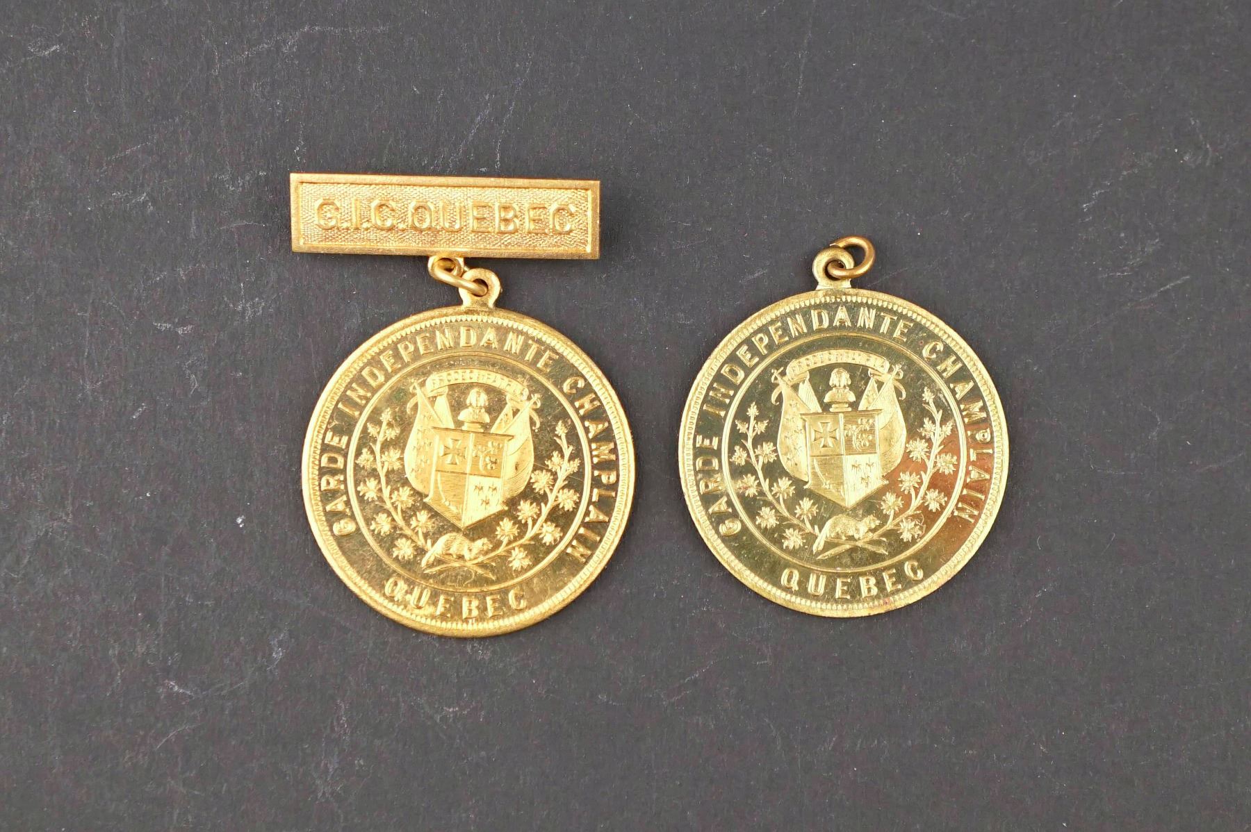 2 Pcs. Assoc. Association des médecins de la langue Française, Shield w/Rod of Asclepius. UNC 42 x 29 mm. 10.9 grs. & 1924 8th Congress in Québec City on a silver looped art deco plaquette by Jean Bailleur (1878-1949) suspended by a red ribbon. Must be viewed. 2 Pcs. Garde Indépendante Champlain 1902, 2nd Convention. UNC, AE-32, 9.0 grs w/loop & 1920 5th Convention. UNC, AE-32 w/hanger and loop 11.9 grs. 3 Pcs. Séminaire de Sainte-Therese Blainville, Qc. First Congress Eucharistic. UNC, AE-31, 11.2 grs w/hanger, same but oval-31 w/hanger & 1925 - 100th Anniversary of the Seminary. AE-34, 10.6 grs w/loop. 3 Pcs. 1919 Salute to the WWI solders by Shawinigan Falls w/header and ribbon by Caron, Young men Congregation of Saint-Sauveur cloistered & 1934 100th Anniversary of Saguenay w/header and ribbon by C. Lemond.