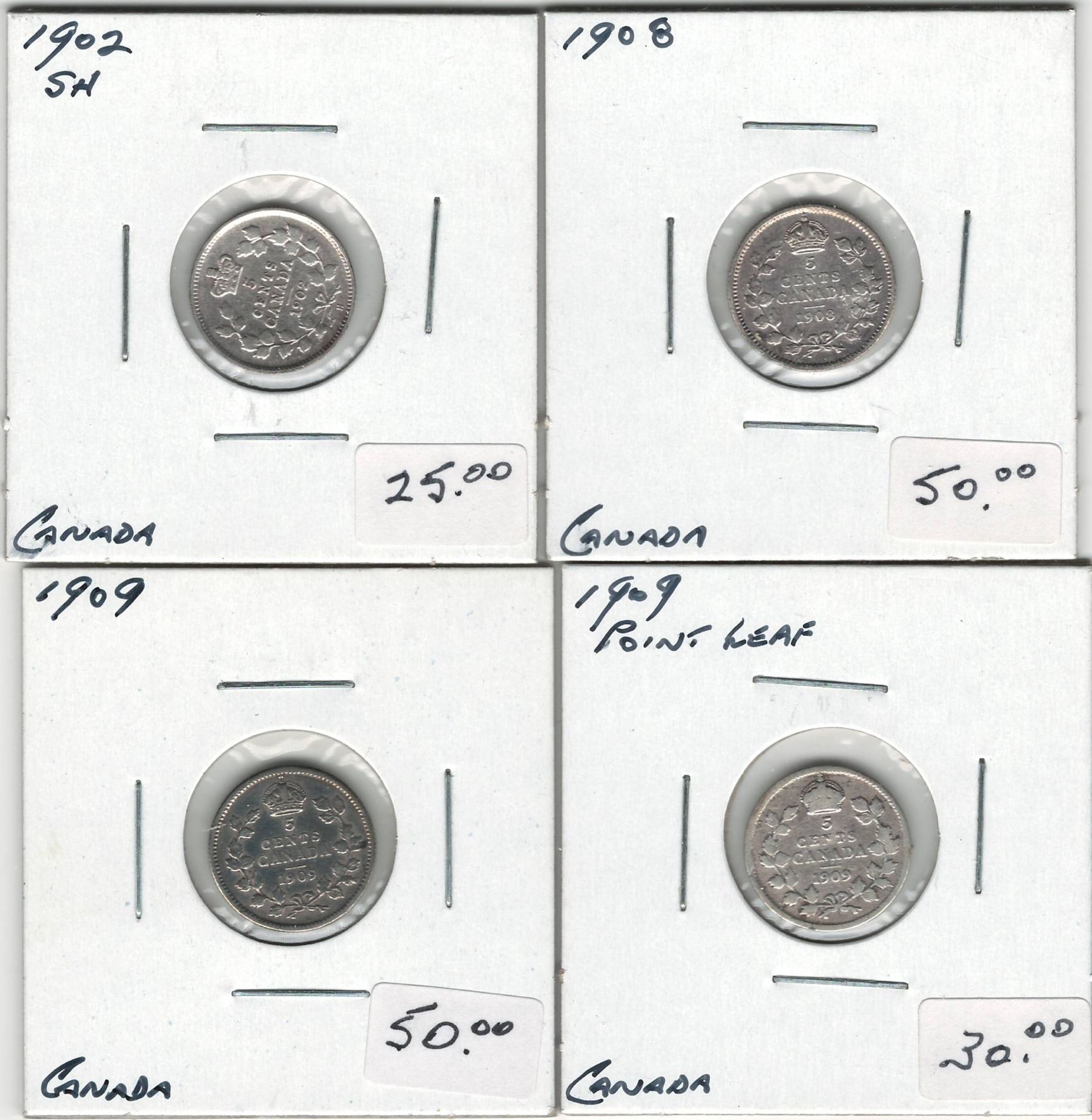 Canada 1902 SH, 1908, 1909 RL, 1909 RL Silver 5 Cent Lot. Circulated. Cleaned.