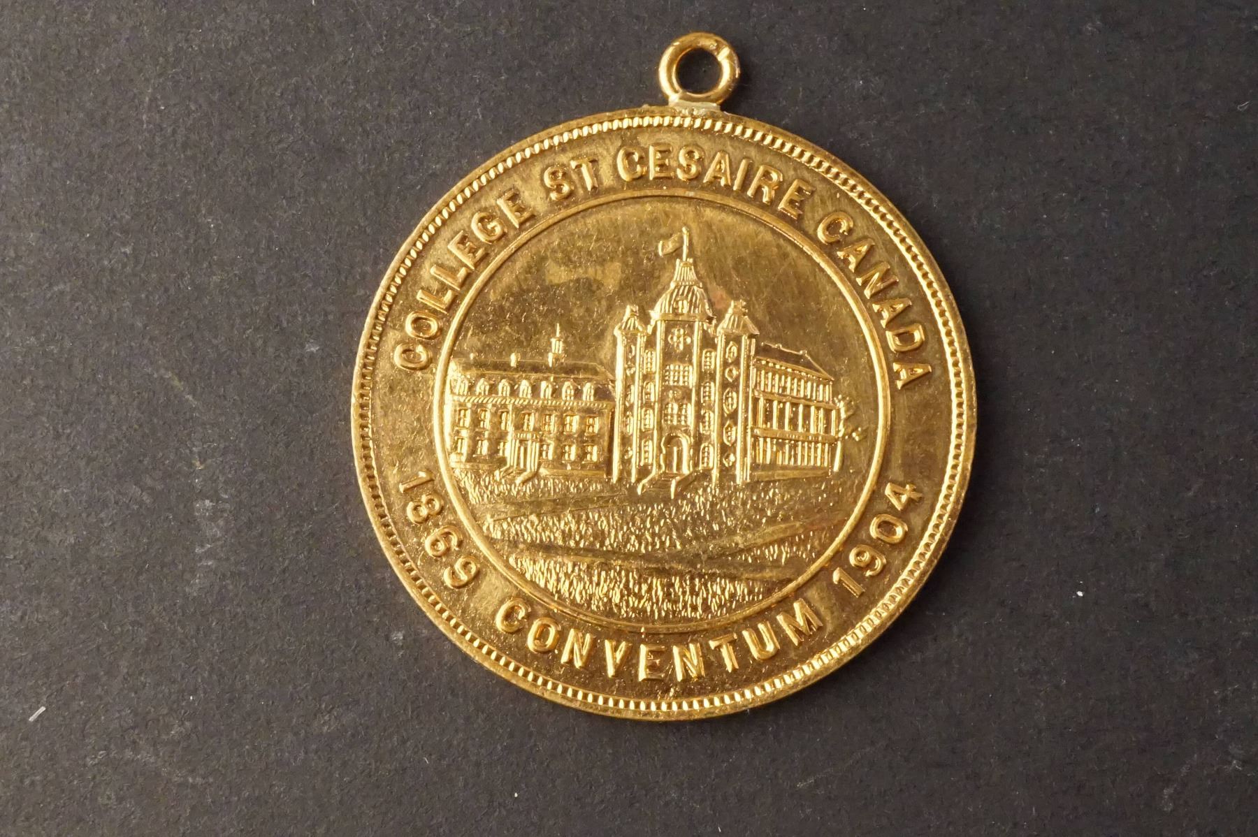 3 Pcs. College de Saint-Césaire Congregation of Sainte Croix 1904 Convention by Whitehead and Hoag. UNC, AE-38, 17.1 grs. same but in gold gilt and loop. UNC, AE-38, 16.5 grs & 1919 50th Anniversary by Caron et Freres. UNC, AE-33 w/loop, 14.3 grs.