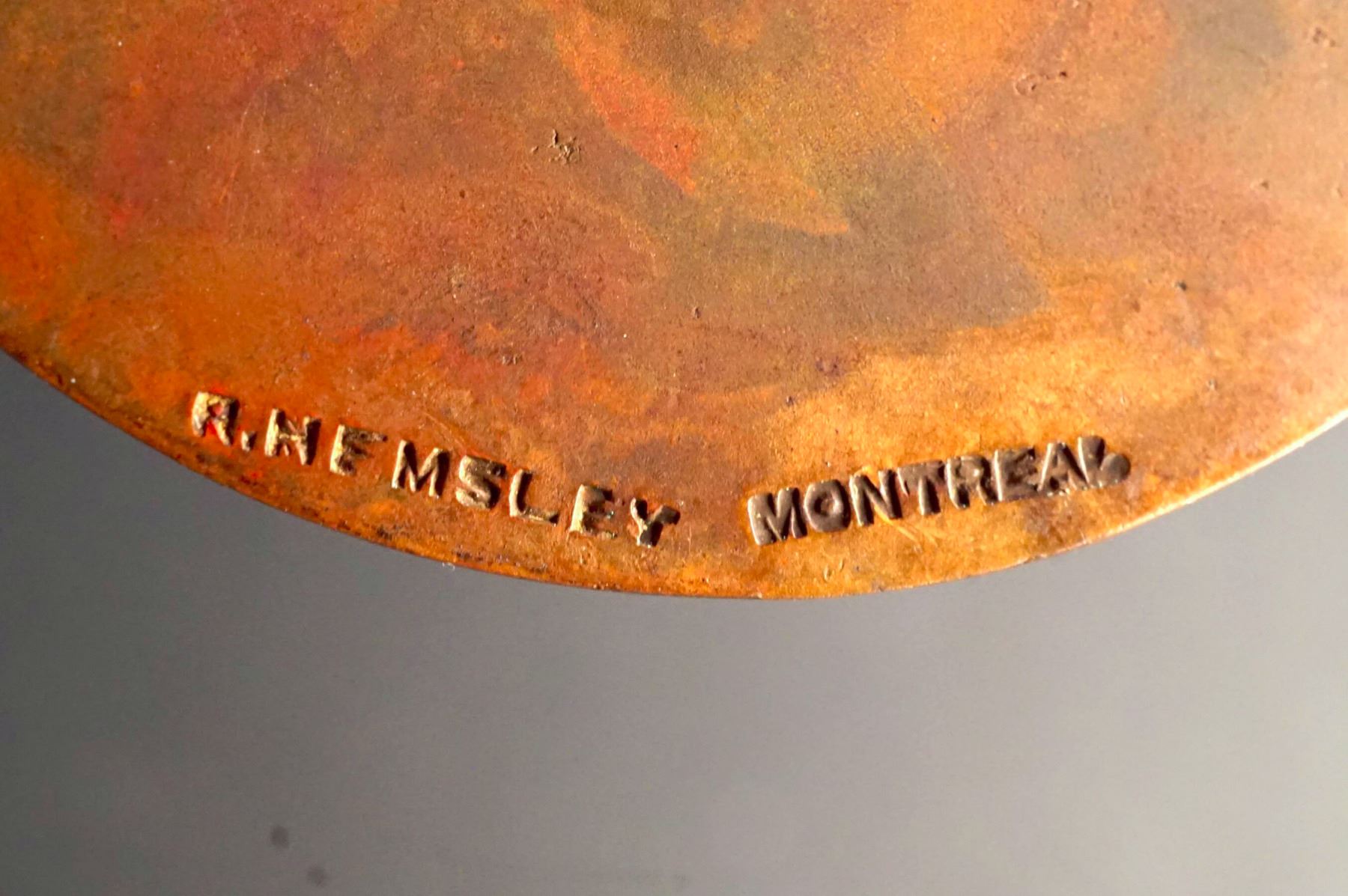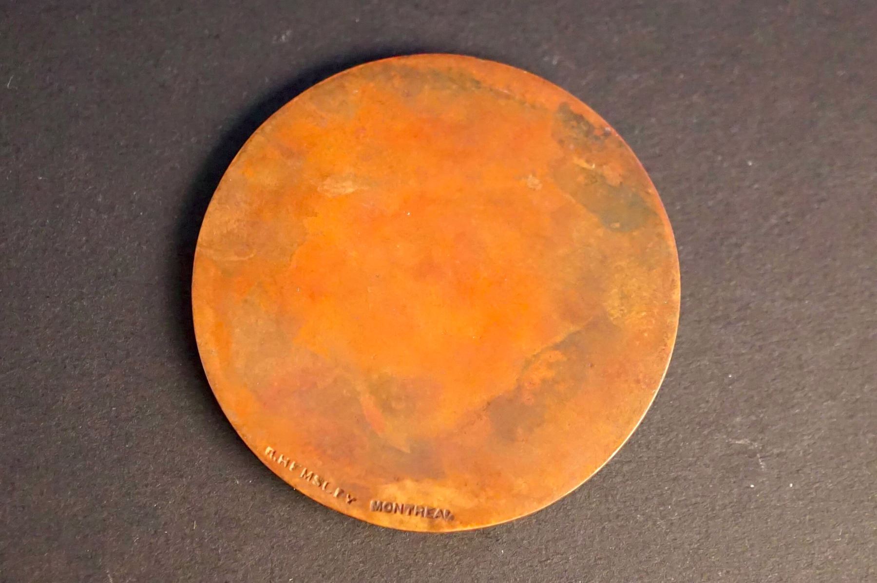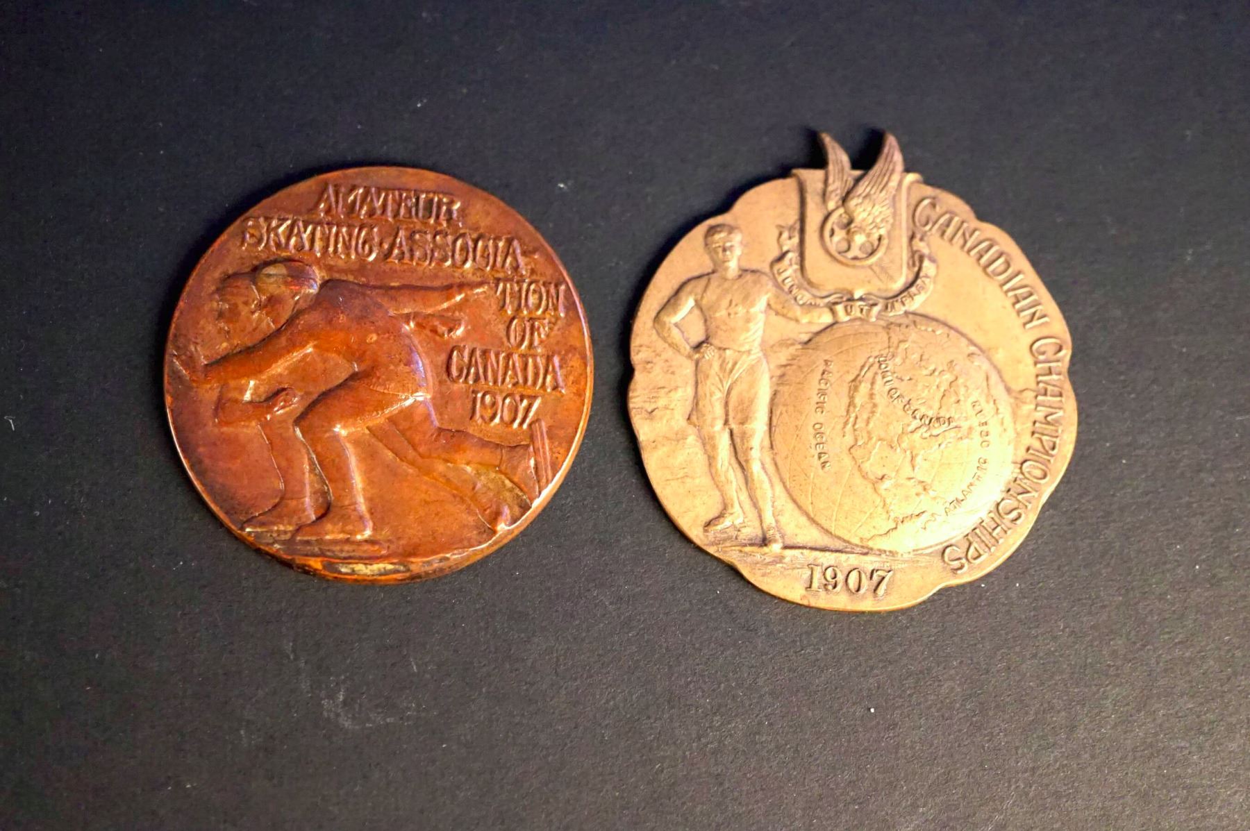 Amateur Skating Association of Canada 1907 Copper Uniface Medal + Large Athletic Medal Canadian Championship 1907 Large Bronze Medal 1) Two speed skater side by side. Reverse is blank except for the maker's mark at bottom, in two stamps: R. Helmsley and Montréal. Copper, 41 mm, 26.0 grams. 2) Athlete leaning against large globe, Canada at center. Winged wheel of Mercury above. Reverse blank. Bronze, 43 mm, 26.7 grams.