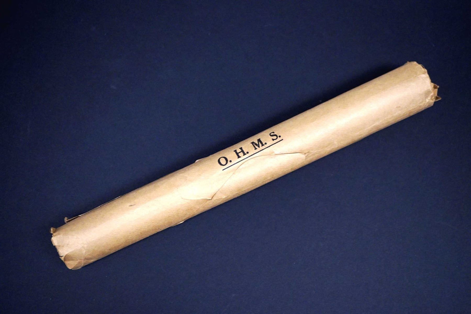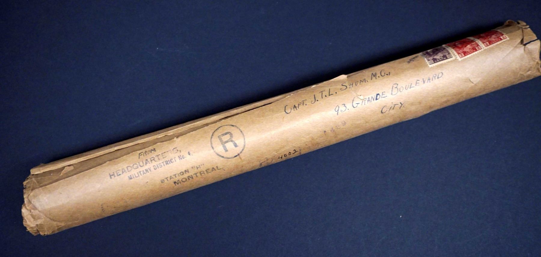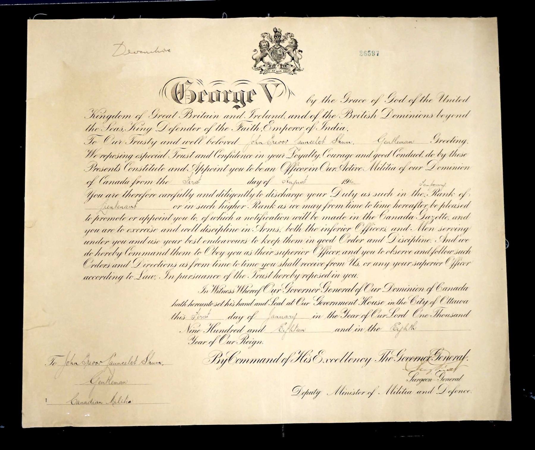 26597 A George V document confirming that John Trevor Lancelot Shum was raised to temporary Lieutenant on August 1, 1916. The document is signed and dated January 1, 1916 by the Surgeon General Dr. Eugene Fiset (Solder, statesman and 18th. Lt-Gov. of Quebec). The document 15 x 13 inch (written on watermarked linen manufactured by Rolland Paper) is in excellent condition. This document was rolled in military mailer paper (M.F.B. 270 H.Q. 1772-39-87) and send by registered mail from military district 4 to Capt. J.T.L.Shum M.G., 93 Grande Boulevard, City The mailer comes with the document.