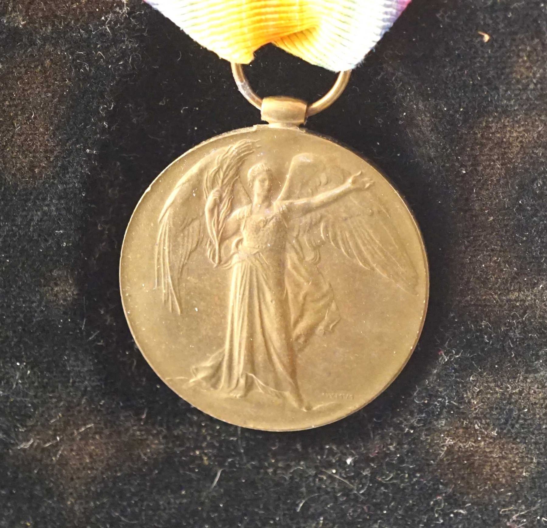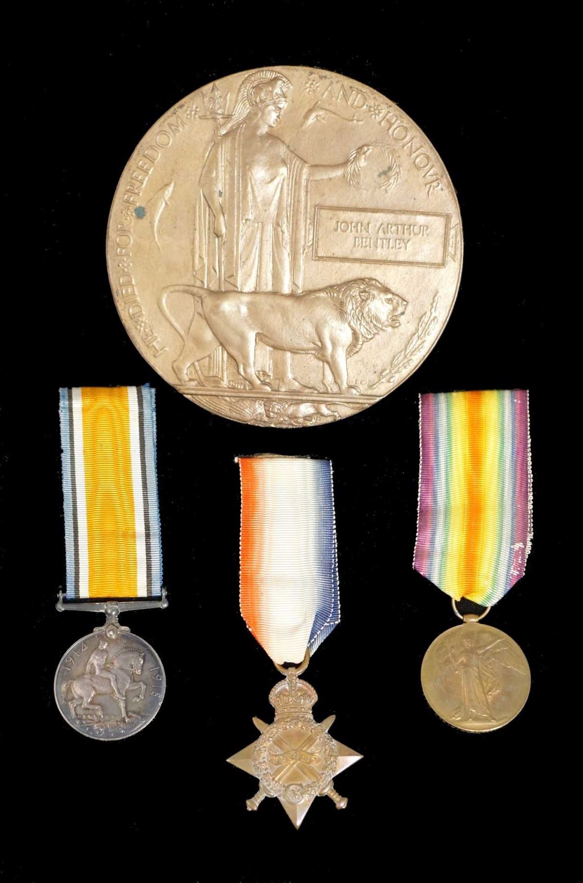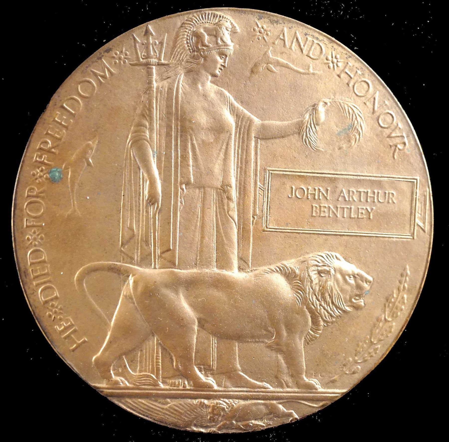 Killed in the sinking of H.M.H.S.LLandovery Castle on June 27, 1918 by a German submarine. Pte. J.A. Bentley was one of 234 victims in this War crime. The medals are named Victory Star medal, British War medal and Victory medal, all with ribbons in Mint shape, mounted with named Death plaque on 13-1/2 x 8 inch flocked board.