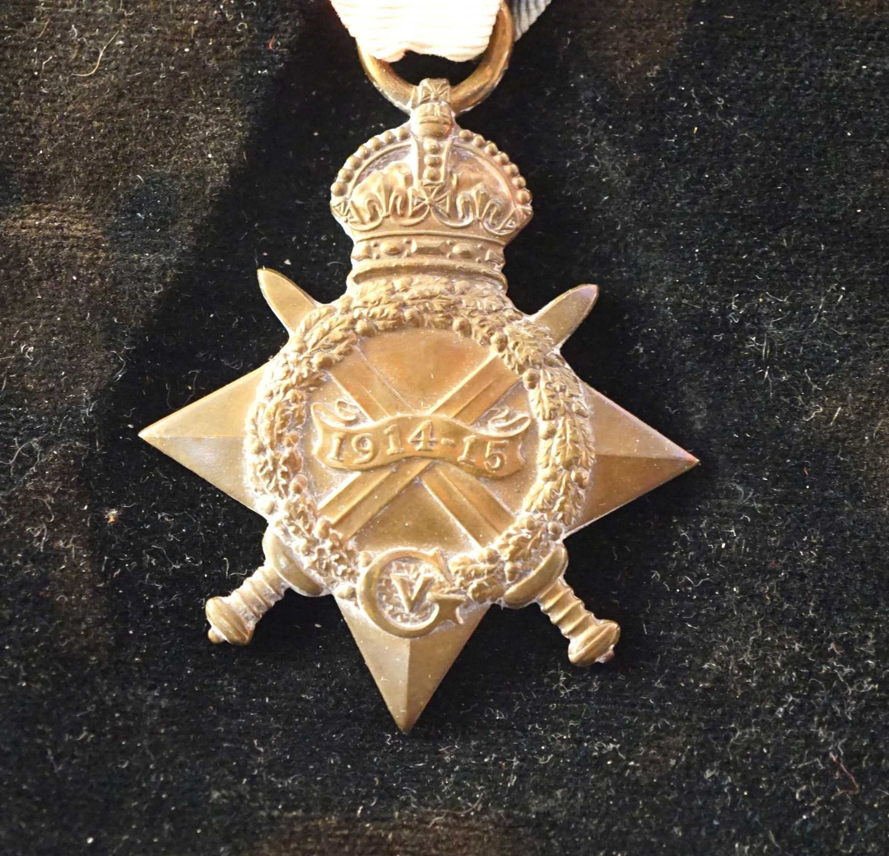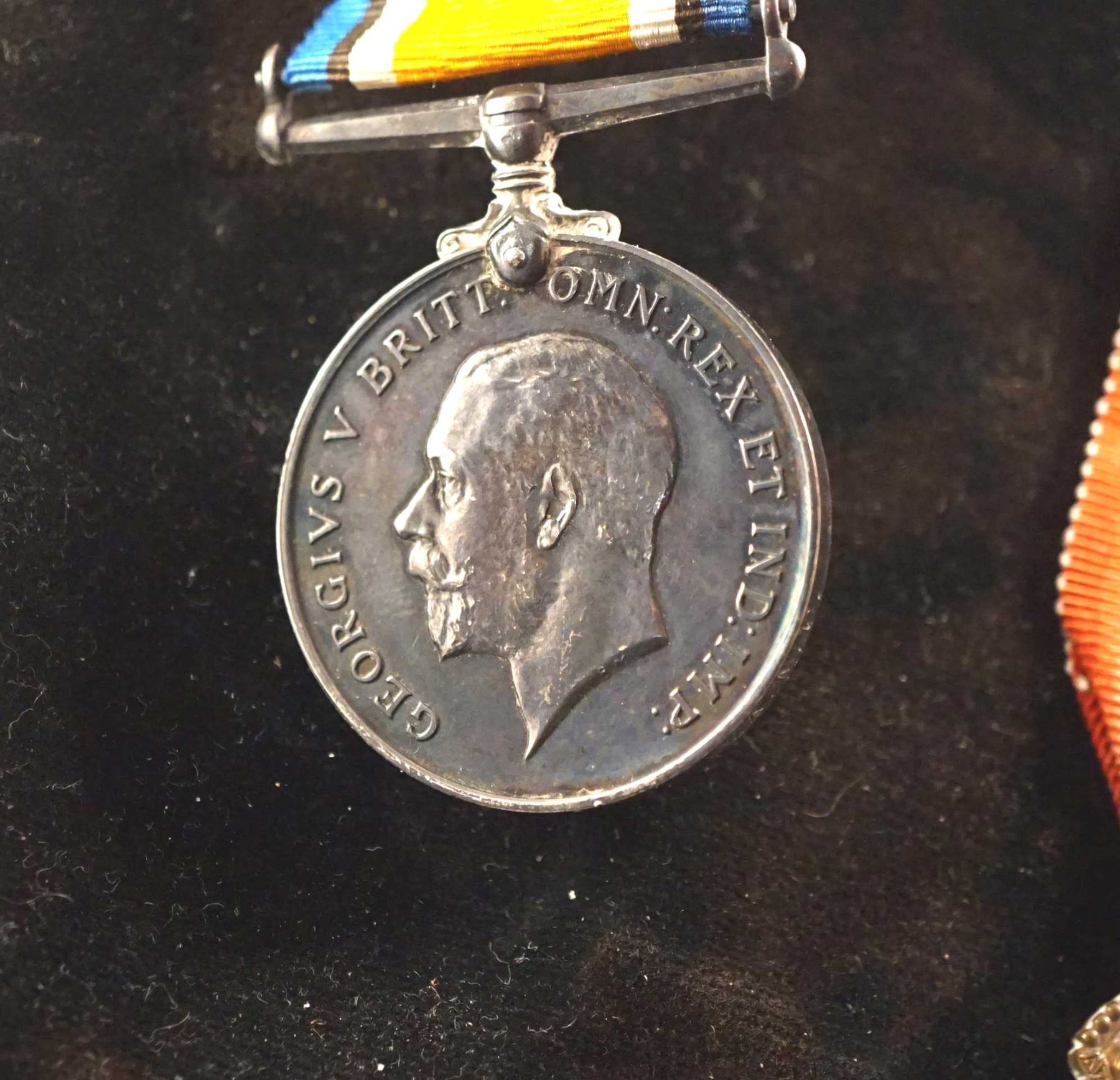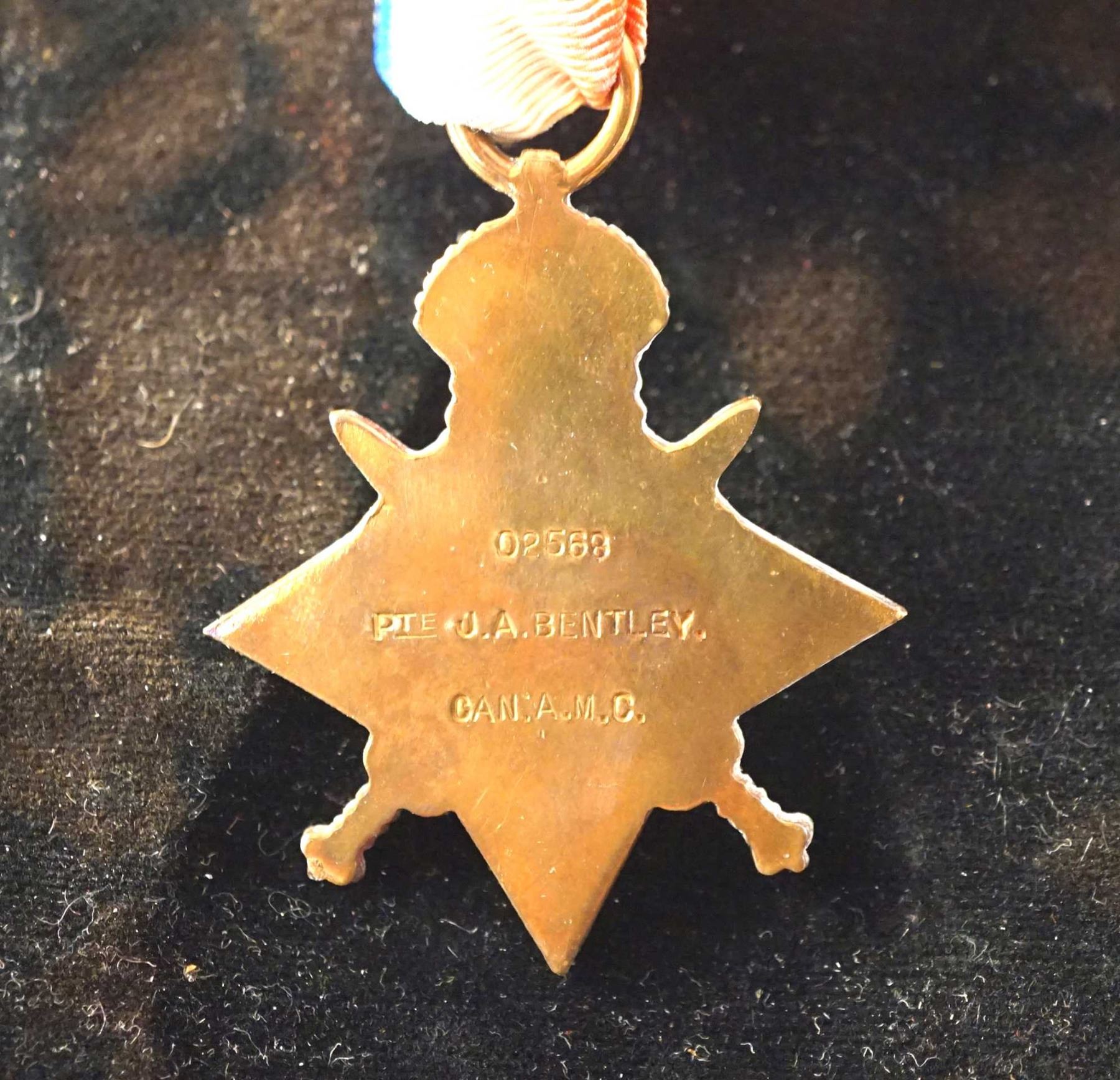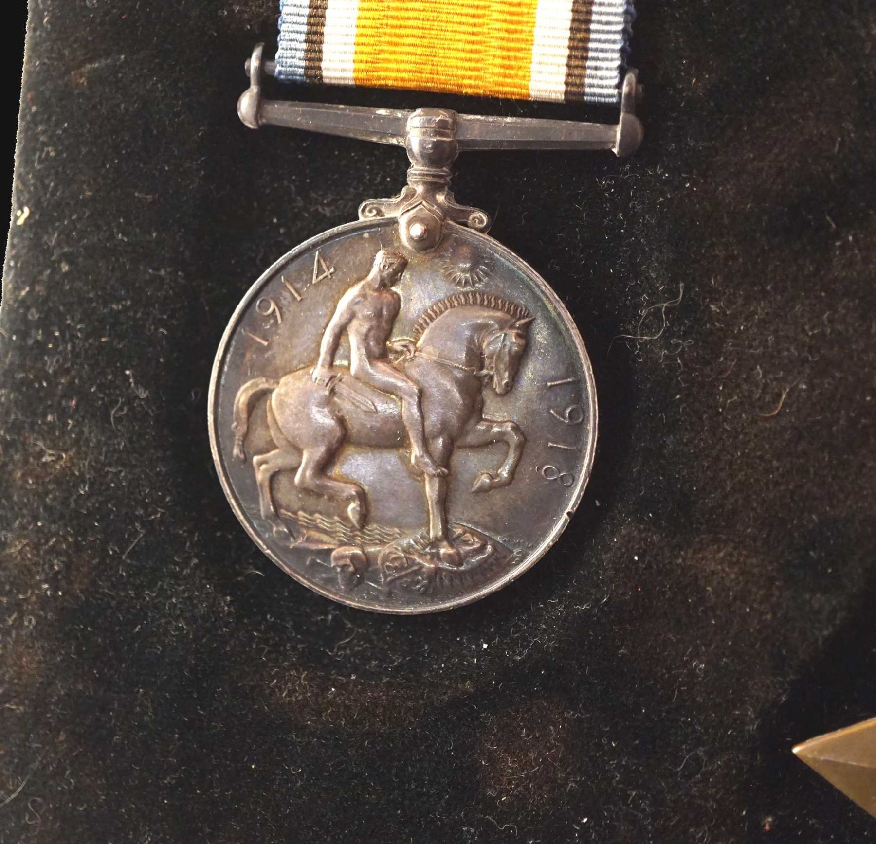 Killed in the sinking of H.M.H.S.LLandovery Castle on June 27, 1918 by a German submarine. Pte. J.A. Bentley was one of 234 victims in this War crime. The medals are named Victory Star medal, British War medal and Victory medal, all with ribbons in Mint shape, mounted with named Death plaque on 13-1/2 x 8 inch flocked board.