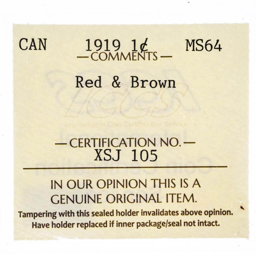 Canada, 1919 Large Cent Red & Brown MS 64 ICCS