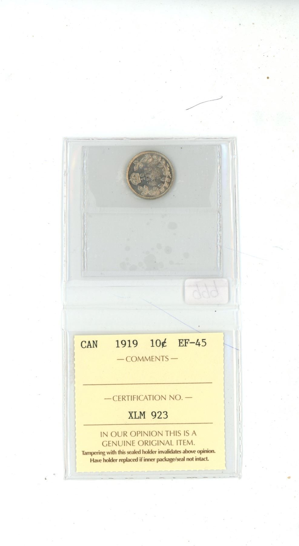 Canada 1919 Silver 10 Cents. ICCS certified and graded EF-45. Nice.